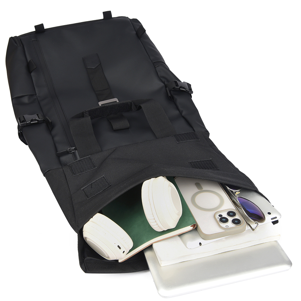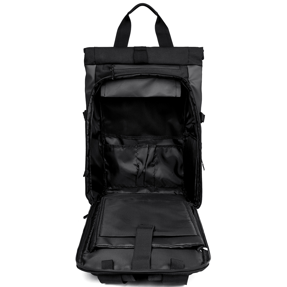 Одно большое ролл-топ отделение имеет два входа: Первый, сверху — укреплённый пластиком край рюкзака фиксируется липучками-велькро и регулируемым по длине ремнём с металлической застёжкой с возможностью увеличения и фиксации объёма на пяти уровнях, Второй, АНТИКРАЖНЫЙ сзади — на водонепроницаемой молнии со скрытым звеном и возможностью открывания на 180 градусов.