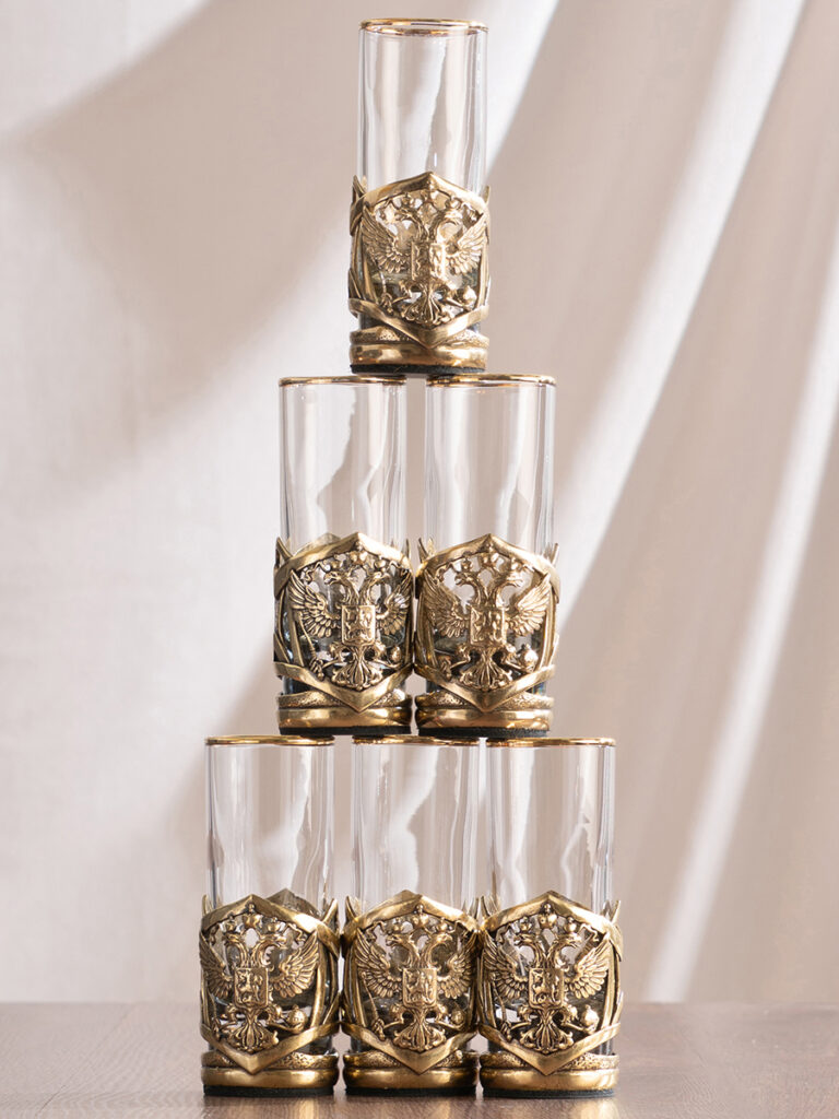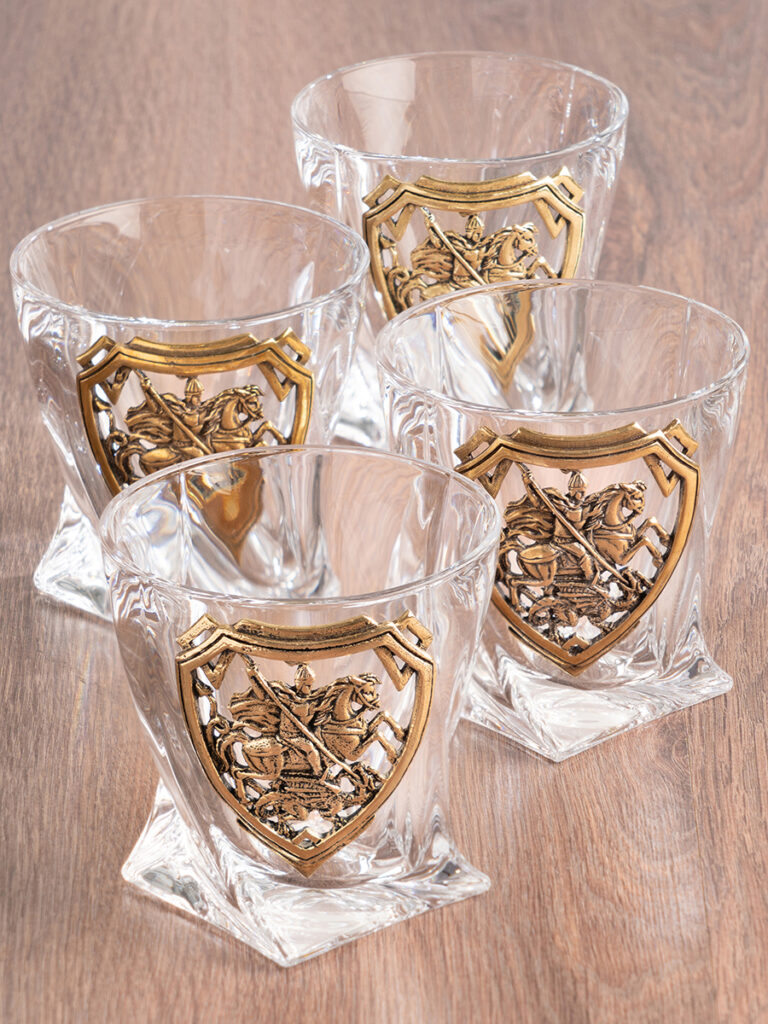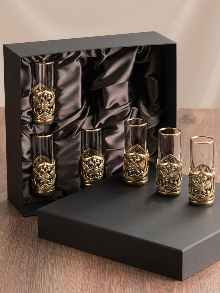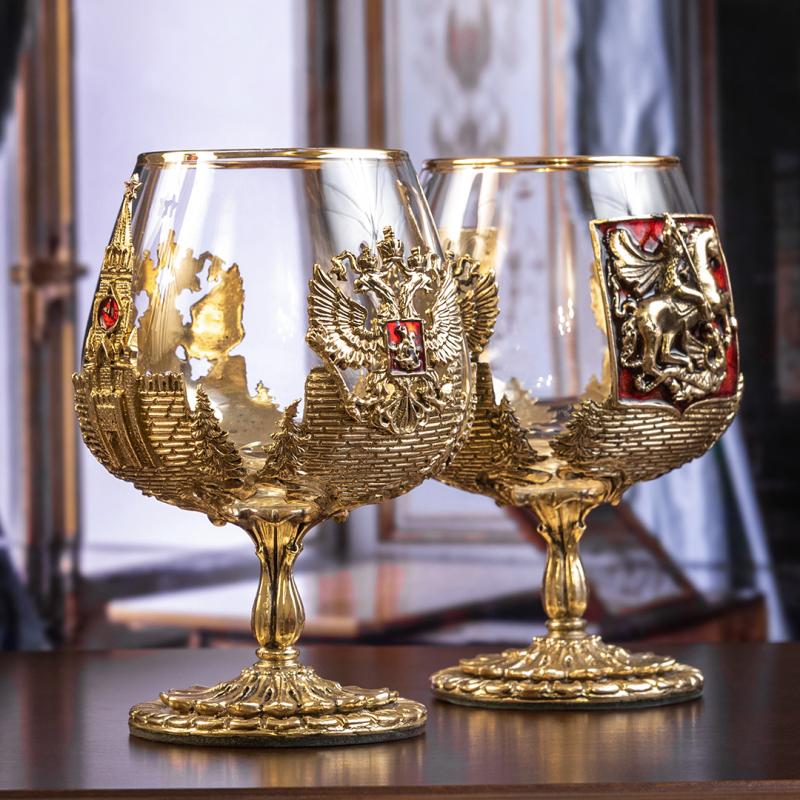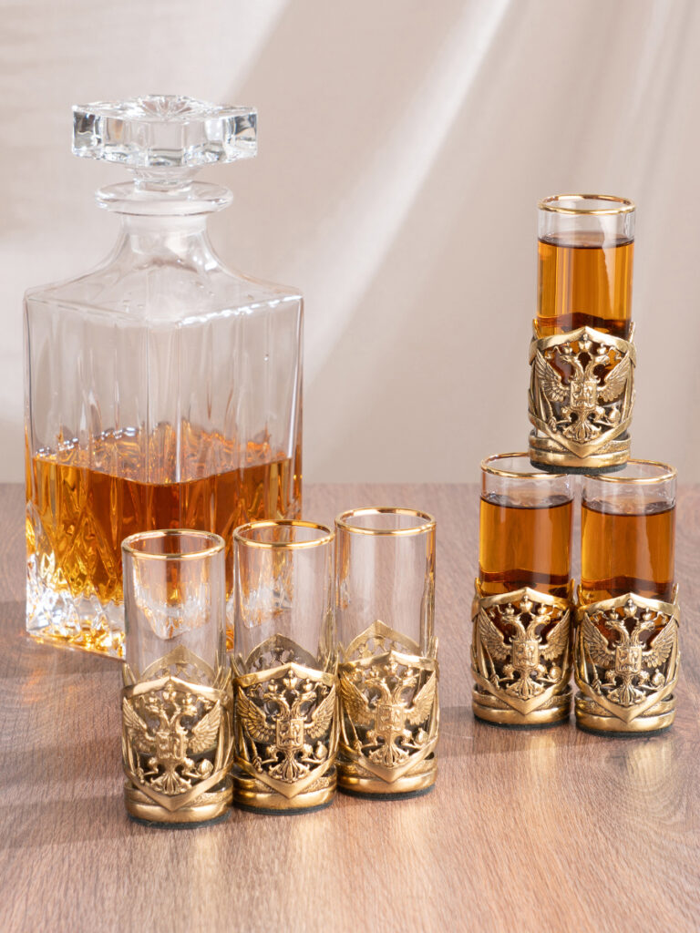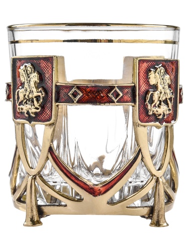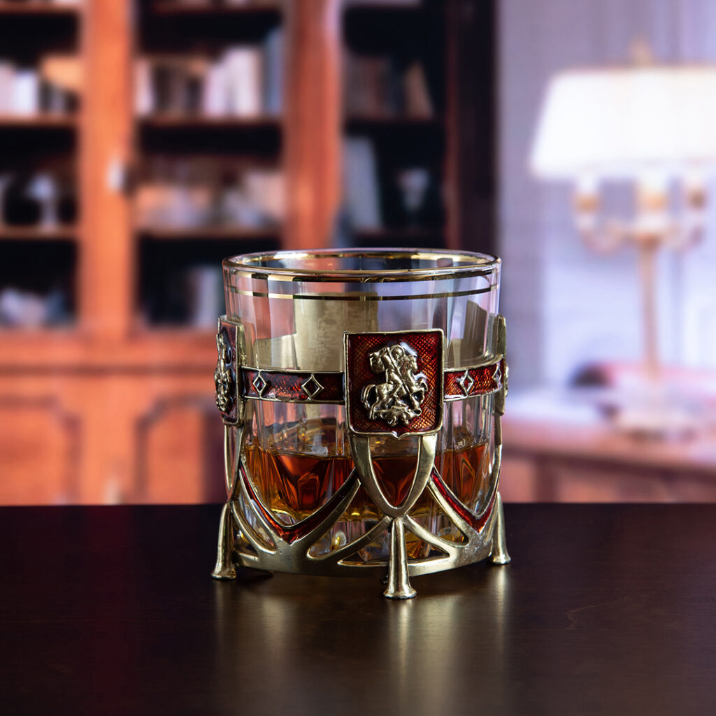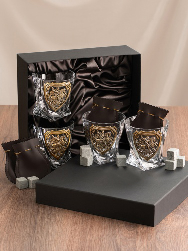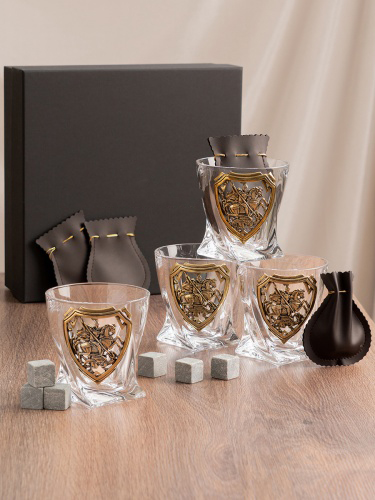 Основной материал — Бокал: стекло с золотым декорированием ,патинированная латунь ручная работа с эмалью, камни для виски (пищевой стеатит)