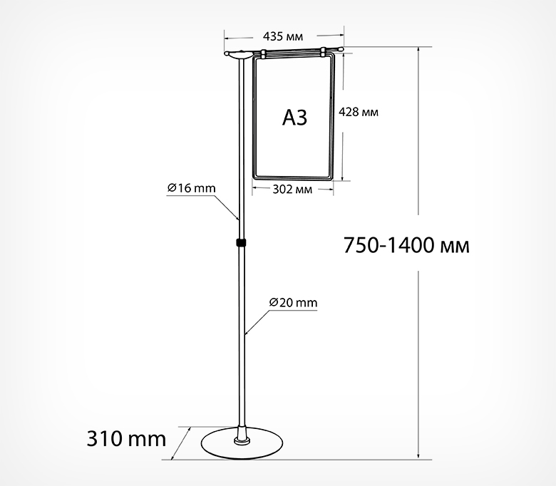 Телескопическая ножка позволяет регулировать высоту стойки, а поворотный механизм держателя фиксирует рамку под заданным углом наклона.