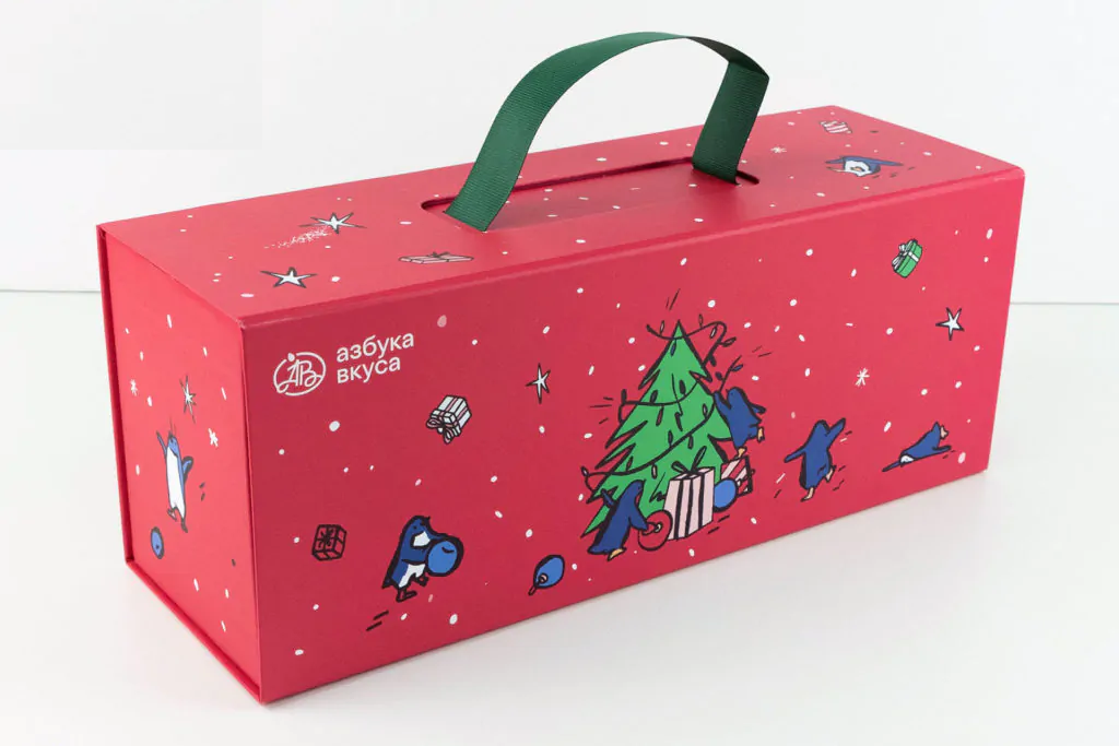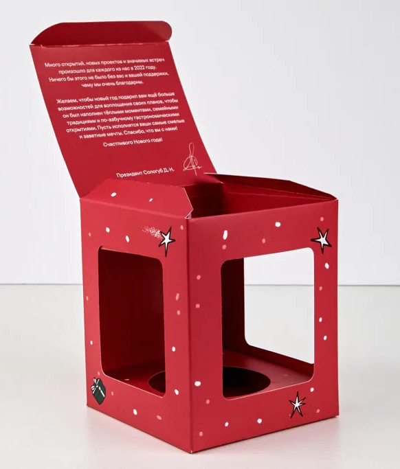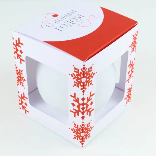 • Наша фирменная с праздничным рисунком. Коробочка с окошками украшена тематическим зимним орнаментом и надписью «С новым годом!» в верхней части. Выглядит стильно и лаконично.