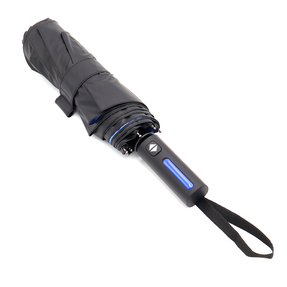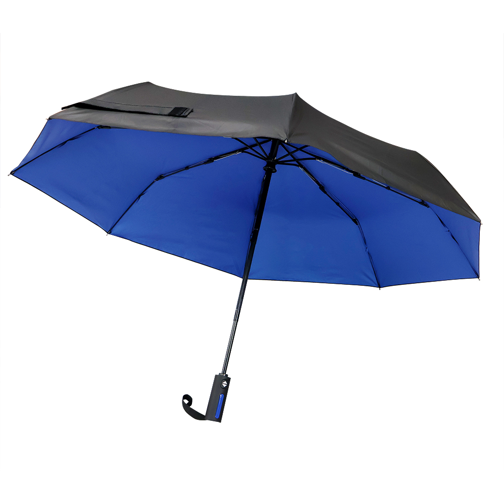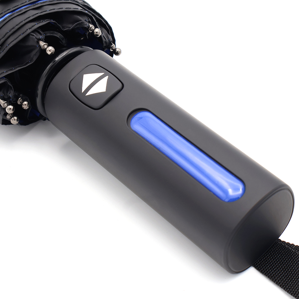 Автоматический противоштормовой складной зонт Sherp. Материал купола – эпонж. На таком материале вода превращается в капельки и скатывается, а сам зонт остается сухим. Цветной элемент на ручке – в тон купола. Ветрозащитная функция – спицы из стекловолокна, а специальное устройство препятствует поломке спиц при резких порывах ветра. Цвет по PANTONE® (максимально приближен): 3590C.