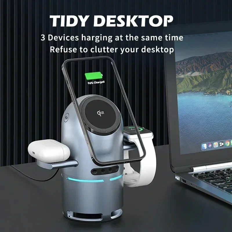 Представляем вам инновационную зарядную станцию 3 в 1, которая станет незаменимым аксессуаром для ваших технологических гаджетов. Беспроводная быстрая зарядка 3 в 1 для Apple iPhone и Android – это не просто удобство, это новый уровень заботы о ваших гаджетах! С этим устройством вы забудете о заморочках с проводами. Теперь зарядите свой айфон, смарт-часы и наушники одновременно, создавая поразительное сочетание эффективности и комфорта. Насладитесь свободой от проводов, которые мешают вам на столе – наша беспроводная док-станция справится с этой задачей легко и стильно. Она поддерживает быструю зарядку вашего телефона, а также имеет встроенную стереосистему Bluetooth, что позволит вам наслаждаться любимыми треками с телефона.