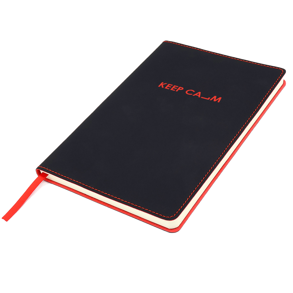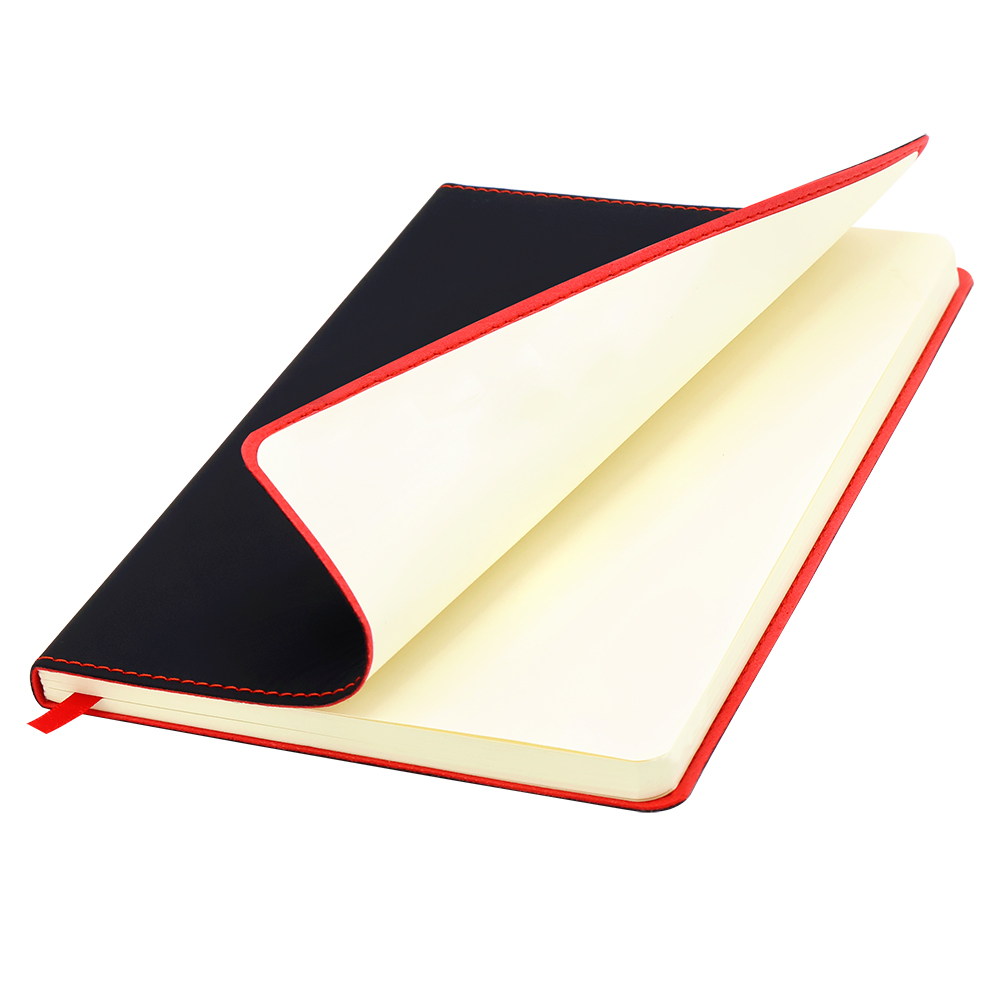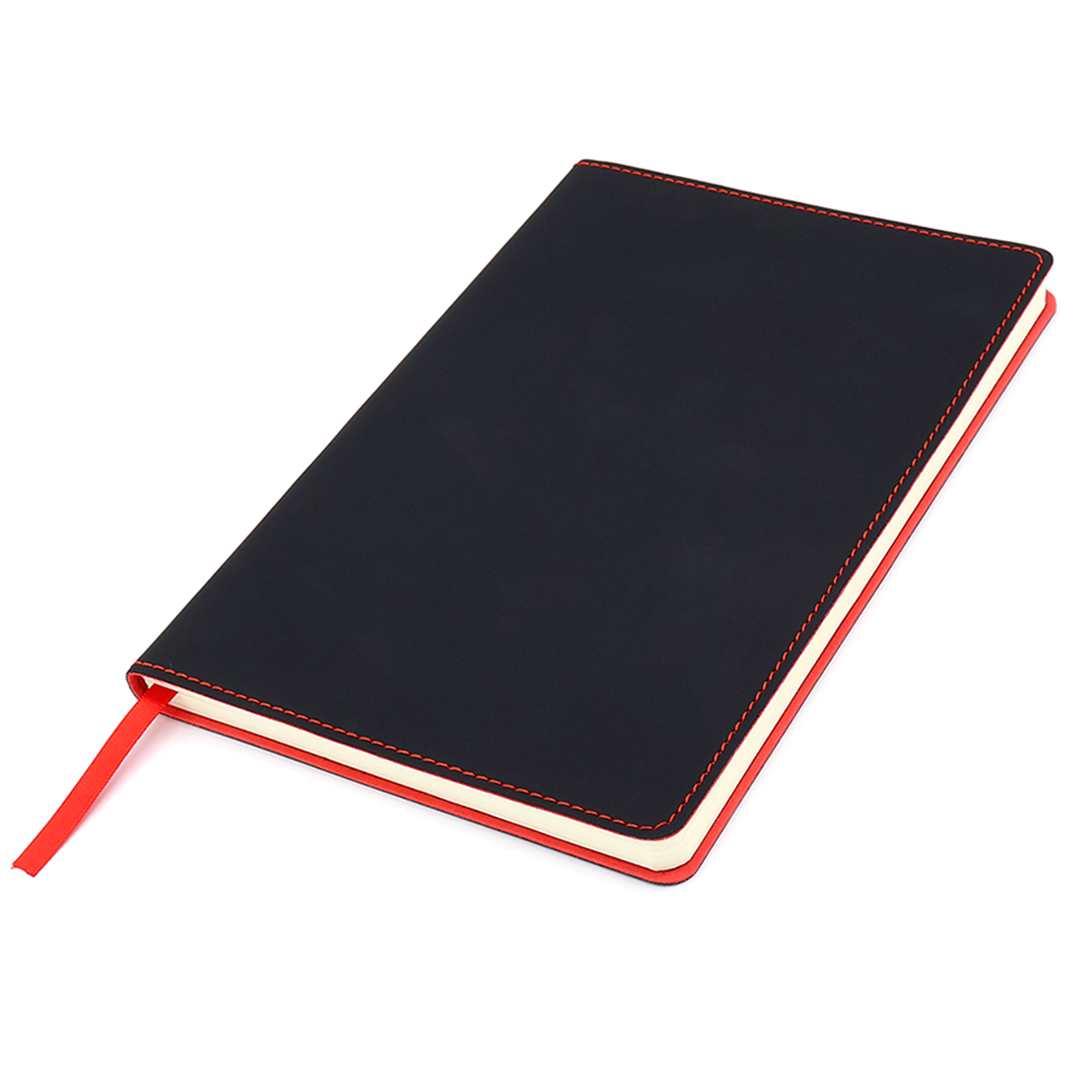 Блонот формата А5 в мягкой обложке из искусственной кожи. Материал обложки — термополиуретан. Основной цвет — чёрный; строчка по периметру, внутенний край и ляссе — красного цвета. Размеры: 214*144мм, 80 листов, разлинееные страницы, бумага плотностью 80г/м2.
