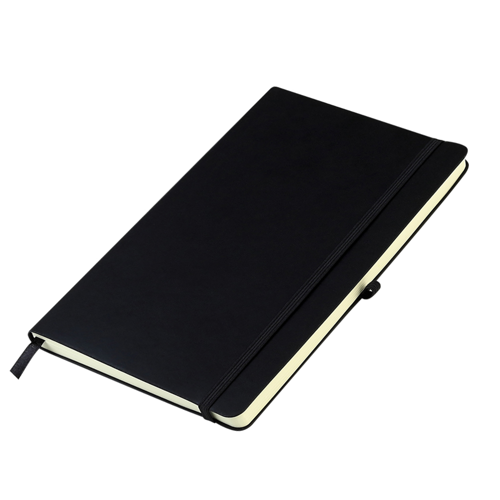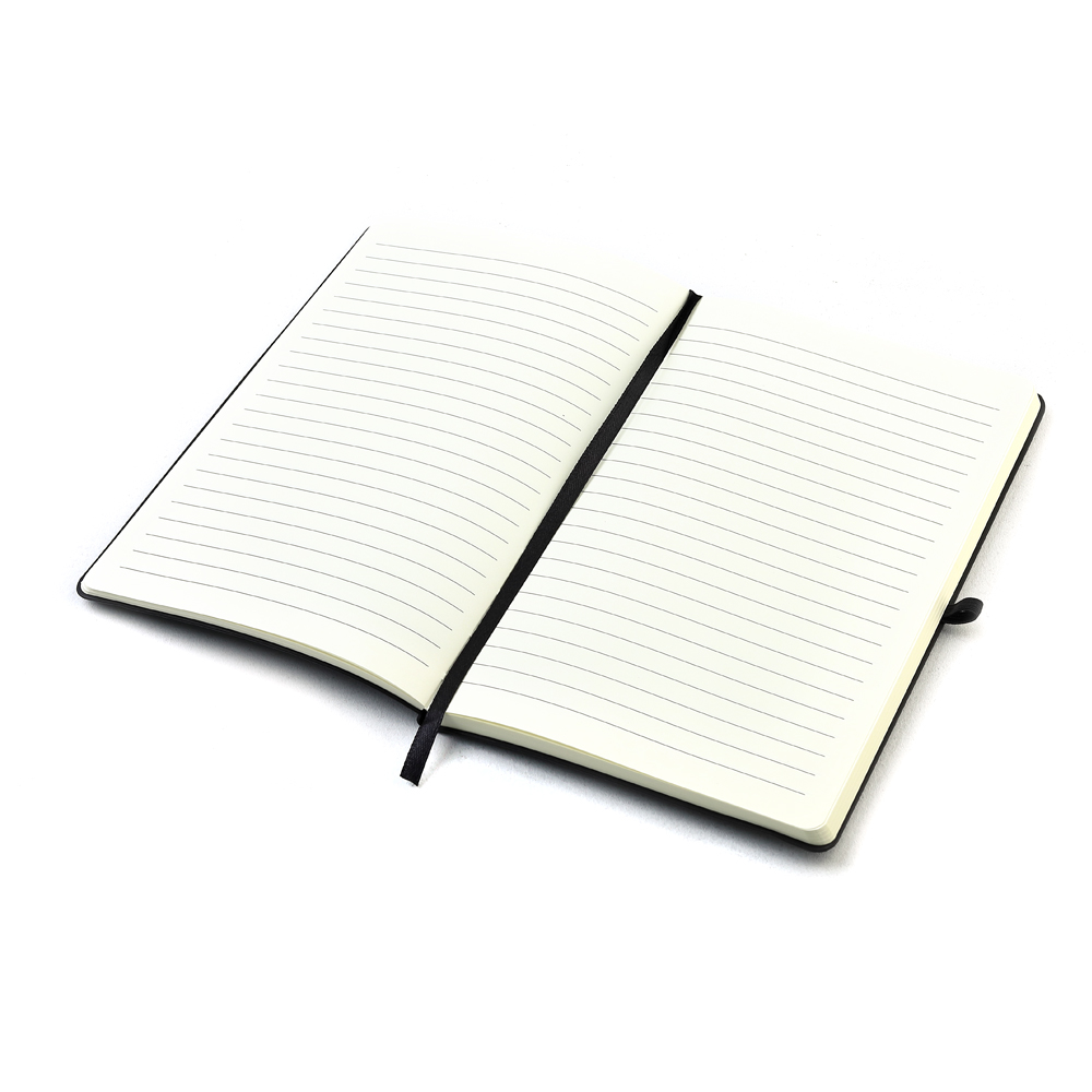 Блокнот формата А5 с мягким покрытием из PU-материала с имитацией рисунка кожи, с эластичной застежкой и текстильной закладкой, наличие петли для ручки в цвет блокнота, 192 страницы, плотность 70г/м, страницы с черными линиями.