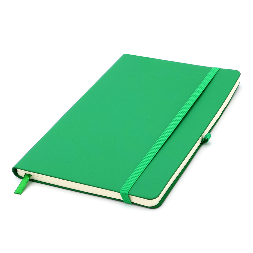 Блокнот формата А5 с мягким покрытием из PU-материала с имитацией рисунка кожи, с эластичной застежкой и текстильной закладкой, наличие петли для ручки в цвет блокнота, 192 страницы, плотность 70г/м, страницы с черными линиями. Цвет по PANTONE® (максимально приближен): 7732 C.