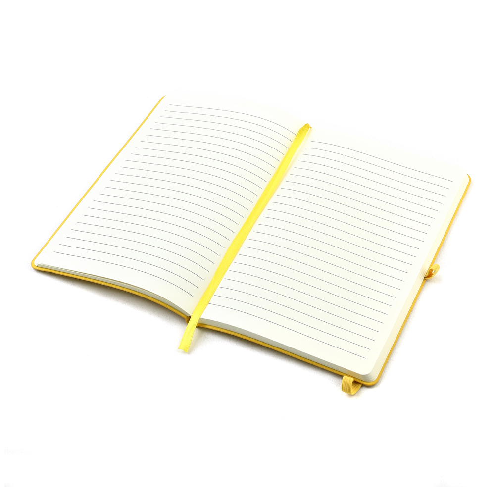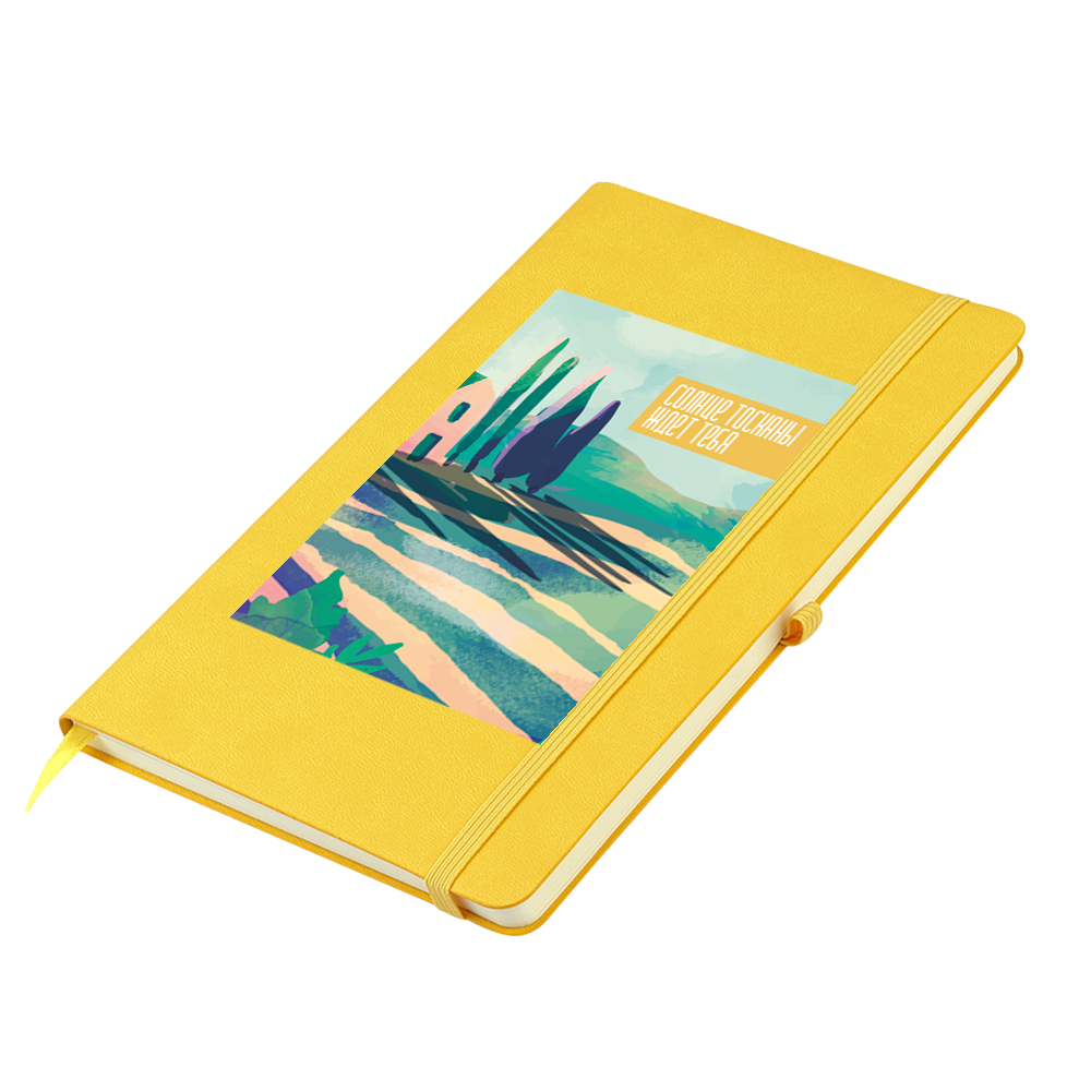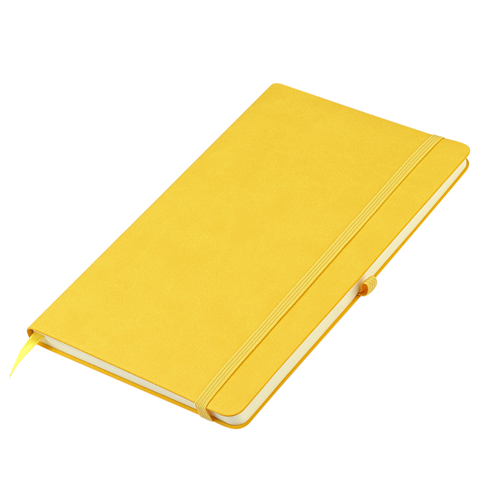 Блокнот формата А5 с мягким покрытием из PU-материала с имитацией рисунка кожи, с эластичной застежкой и текстильной закладкой, наличие петли для ручки в цвет блокнота, 192 страницы, плотность 70г/м, страницы с черными линиями. Цвет по PANTONE® (максимально приближен): 109C.