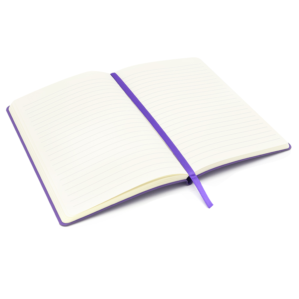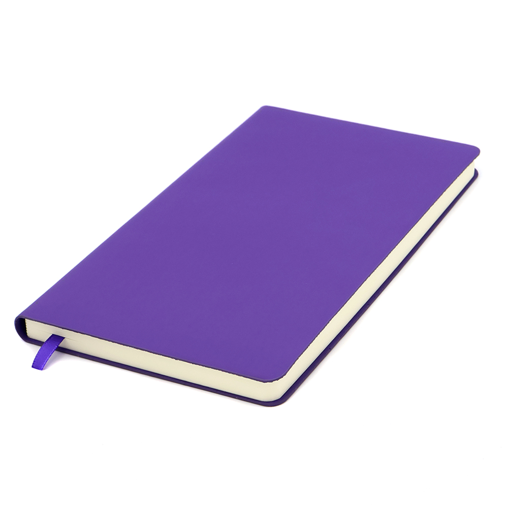 Блокнот формата А5 с мягкой обложкой из PU-материала, имеющего текстуру, имитирующую поверхность натуральной кожи; с текстильной закладкой в цвет блокнота, 256 страниц, плотность 70г/м, страницы с черными линиями. Цвет по PANTONE® (максимально приближен): 2096 С