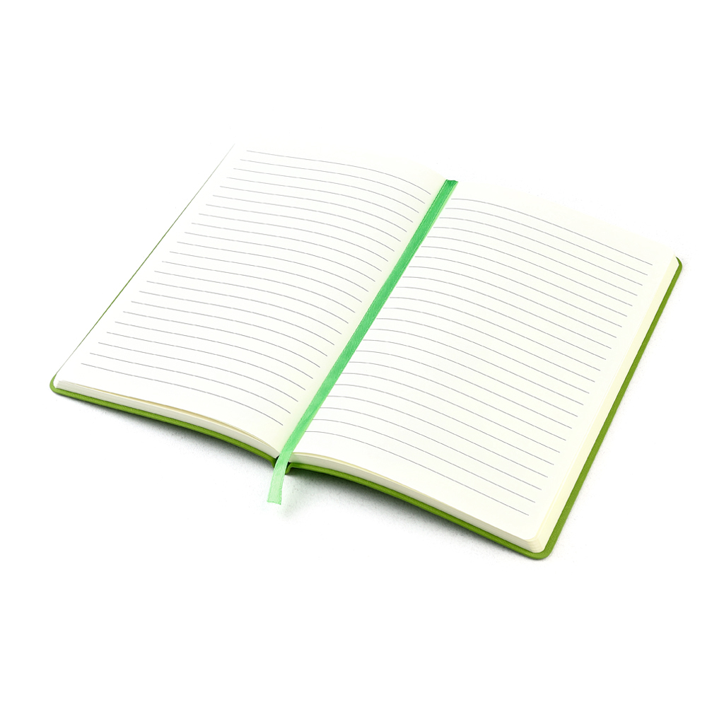 Блокнот формата А5 с мягкой обложкой из PU-материала, имеющего текстуру, имитирующую поверхность натуральной кожи; с текстильной закладкой в цвет блокнота, 256 страниц, плотность 70г/м, страницы с черными линиями. Цвет по PANTONE® (максимально приближен): 2276C.