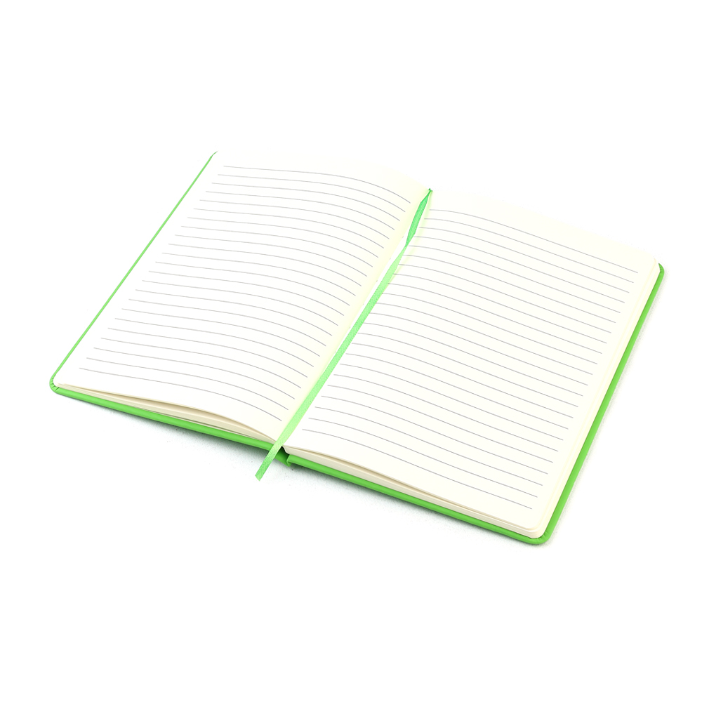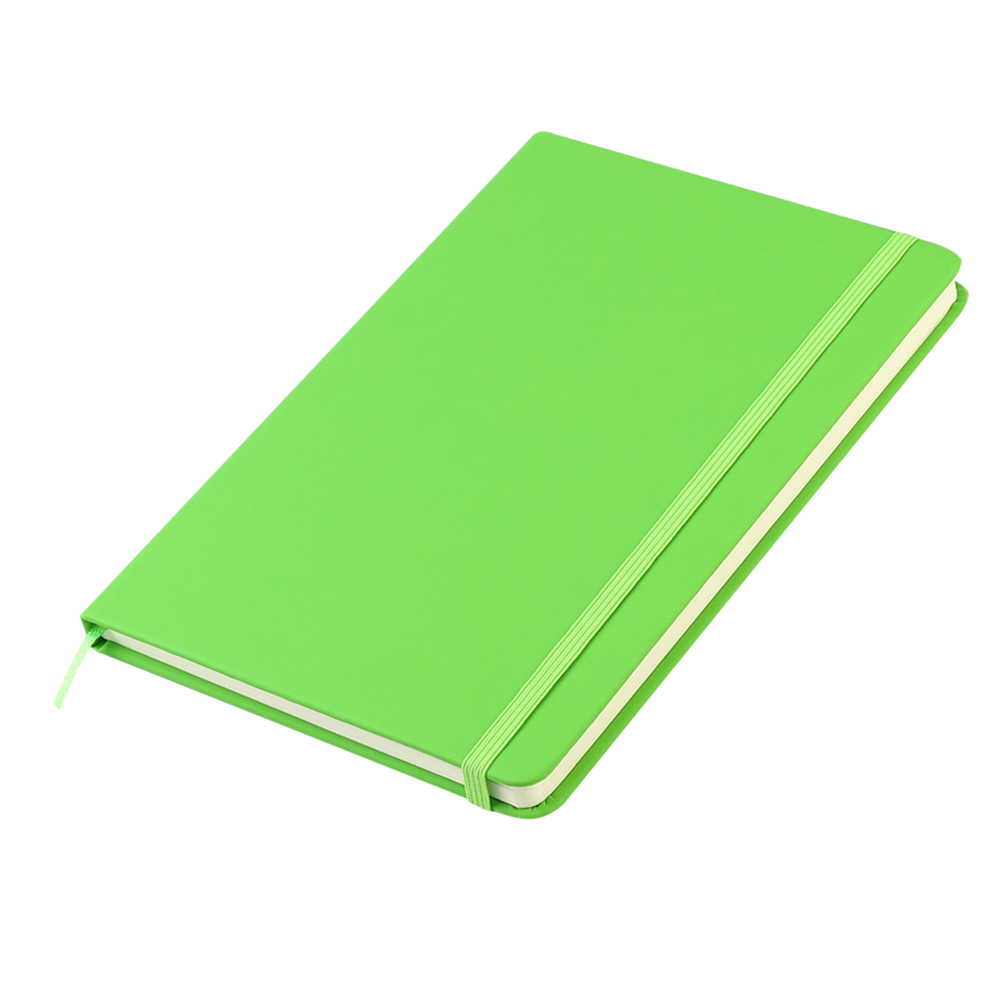 Блокнот формата А5 с твердым покрытием из PU-материала с имитацией рисунка кожи, с эластичной застежкой для закрытия и текстильной закладкой в цвет блокнота, 192 страницы / 96 листов, плотность 70г/м, страницы с черными линиями. Цвет по PANTONE® (максимально приближен): 368C.