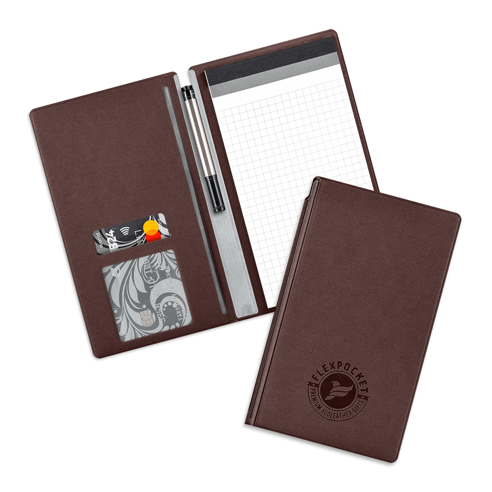 Стильная обложка для блокнота, функциональный и привлекающий глаз аксессуар. Внутри, кроме блокнота снабженного перфорацией для отрыва, находится дополнительный карман для документов или рекламных материалов, а также отделения для пластиковой карты или визитки. Внешняя часть не только выполняет защитную функцию, но и является поверхностью для размещения Вашего логотипа, фирменного оформления или другого изображения.