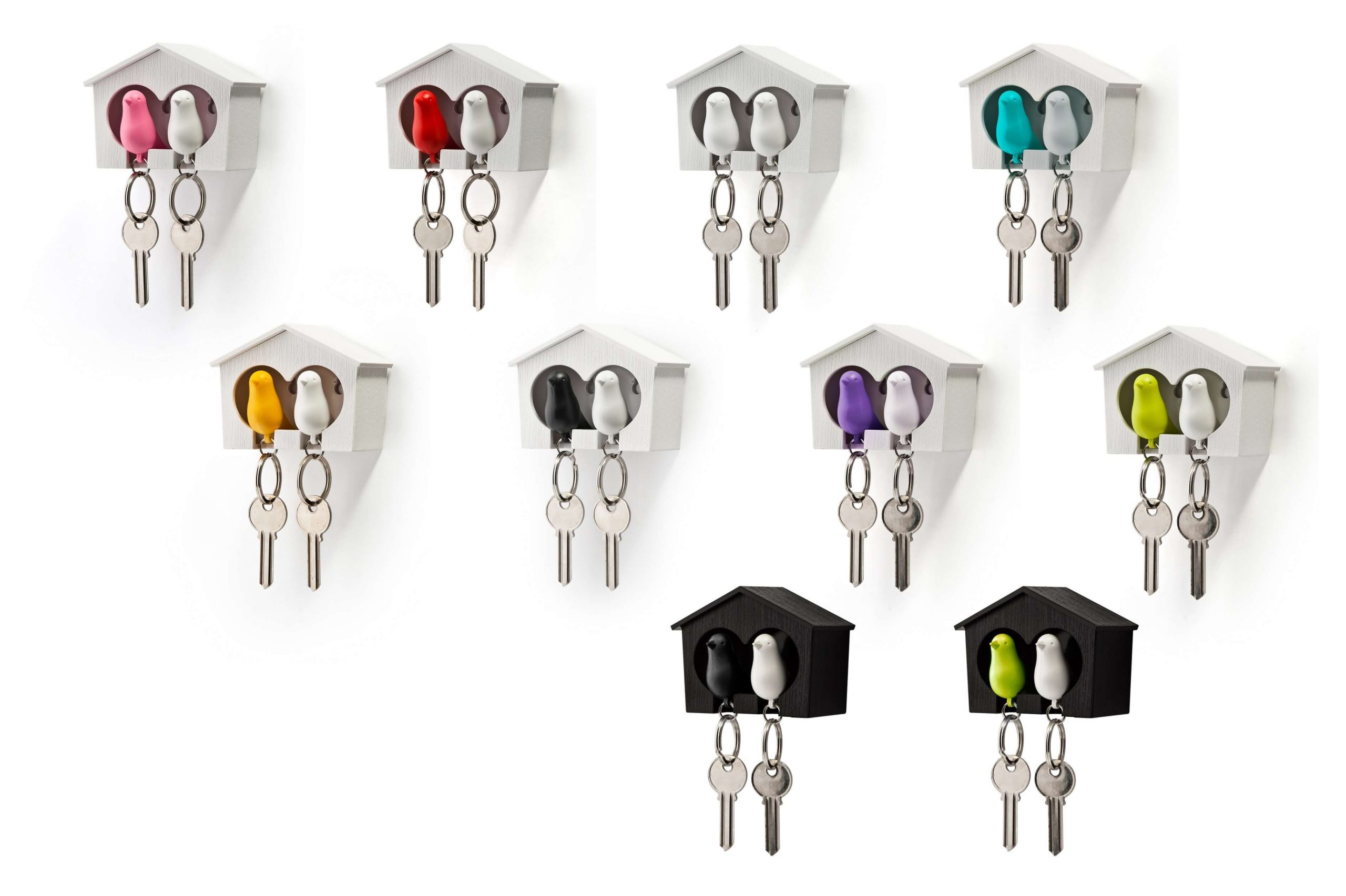 Замечательная идея от дизайнеров тайского бренда Qualy ― специальный домик для персональных хранителей ключей в виде птичек! Теперь Вы всегда будете знать, где ключи, а не искать их на полках перед выходом из дома. Удобный брелок легко помещается внутрь домика, быстро находится в сумке или в кармане, а главное – он является еще и свистком! Так что можно оповестить домашних о своем приходе с работы:) В данном случае мы предлагаем Вам семейный вариант ― птичка для нее и для него. Сладкая парочка в домике будет обозначать, что семья в сборе! Держатель крепится к стене на специальный надежный скотч , либо вешается на два шурупа. Основные характеристики: