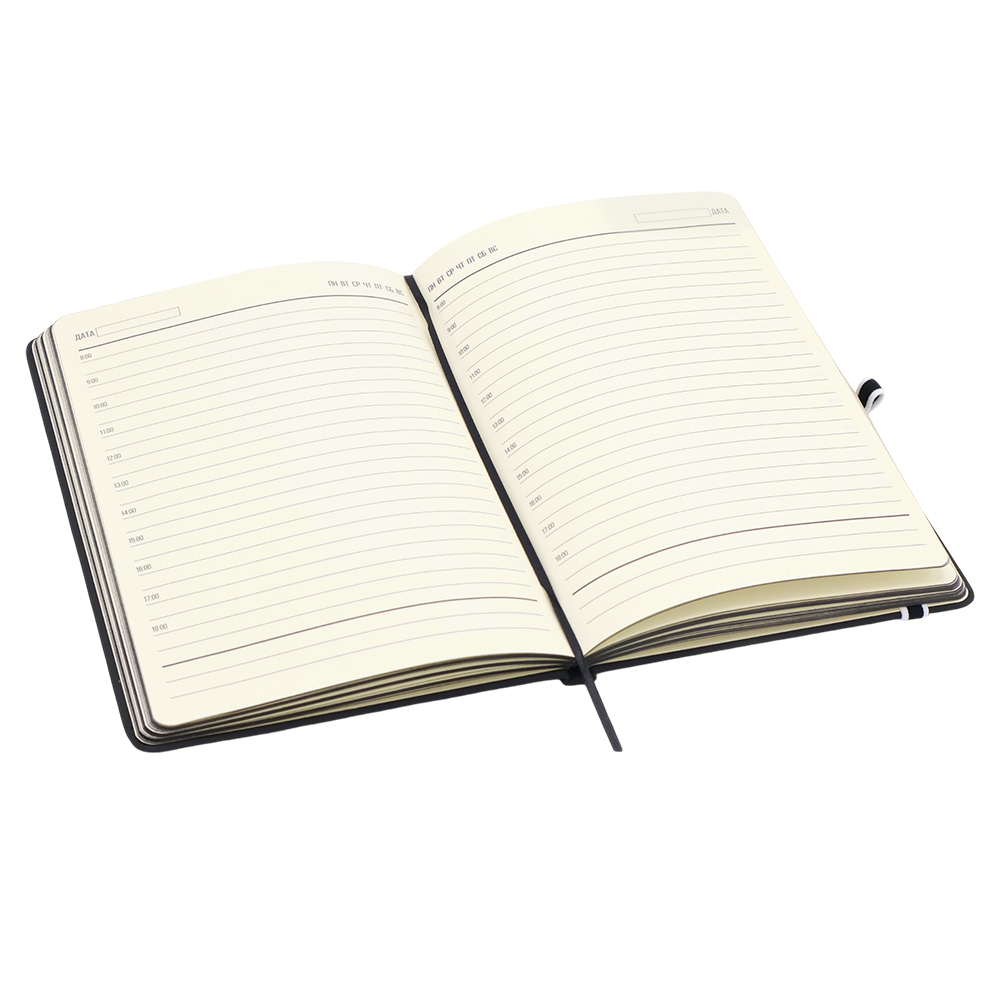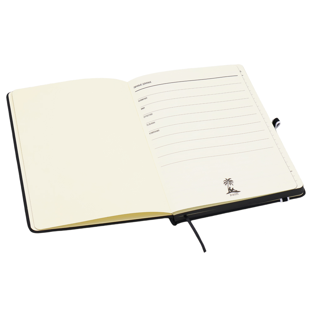 Ежедневник Sir Lewis — выполнен в твердой обложке. Имеет удобную, широкую резинку (1 см.) и держатель для ручки с ярким акцентом. Закладка и край — также в черном цвете. В начале ежедневника страничка с личными данными.
