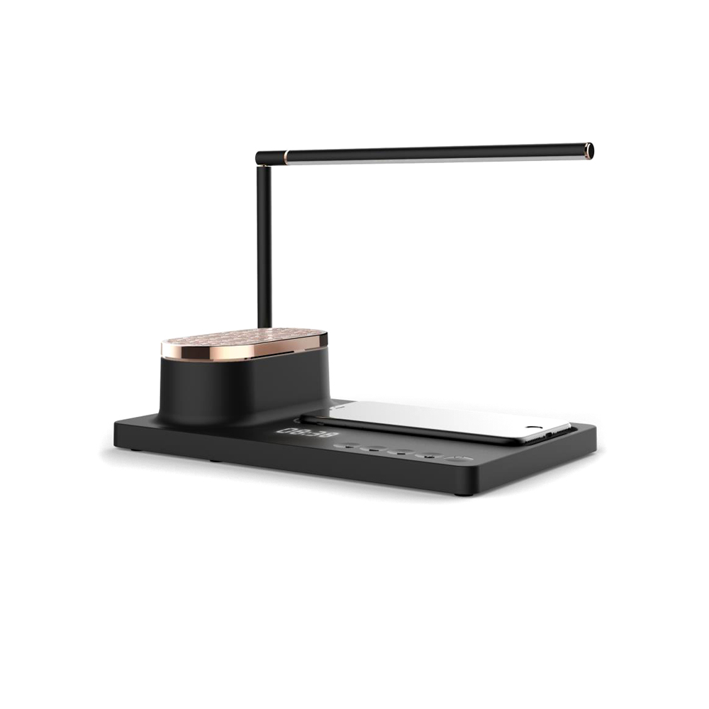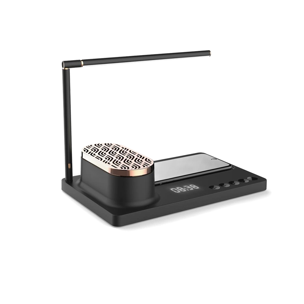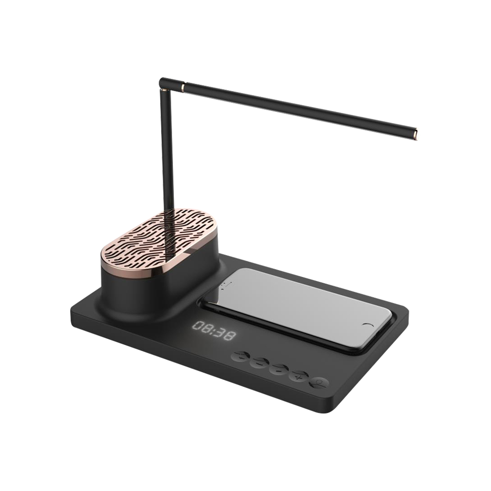 Строгий дизайн и богатый функционал настольной лампы Volando позволит использовать ее как офисный аксессуар, так и как прикроватную лампу для ночного чтения. С функцией беспроводной зарядки Qi мощностью 15W в основании и музыкальной проигрывающей bluetooth колонкой, а также дисплеем для отображения времени. Тип лампы LED, цветовая температура 4000-4500К, мощность лампы: 10W. Питание: 9V/2A. Беспроводная зарядка 9V-3A. Bluetooth JR4. Мощность колонки 5Ω/4W*2. В комплекте сетевой адаптер и инструкция.