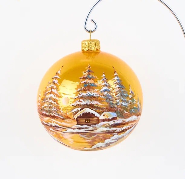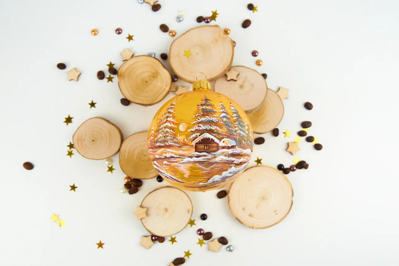 Ёлочный шарик ручной росписи «Домик в лесу АКВАРЕЛЬНЫЙ»