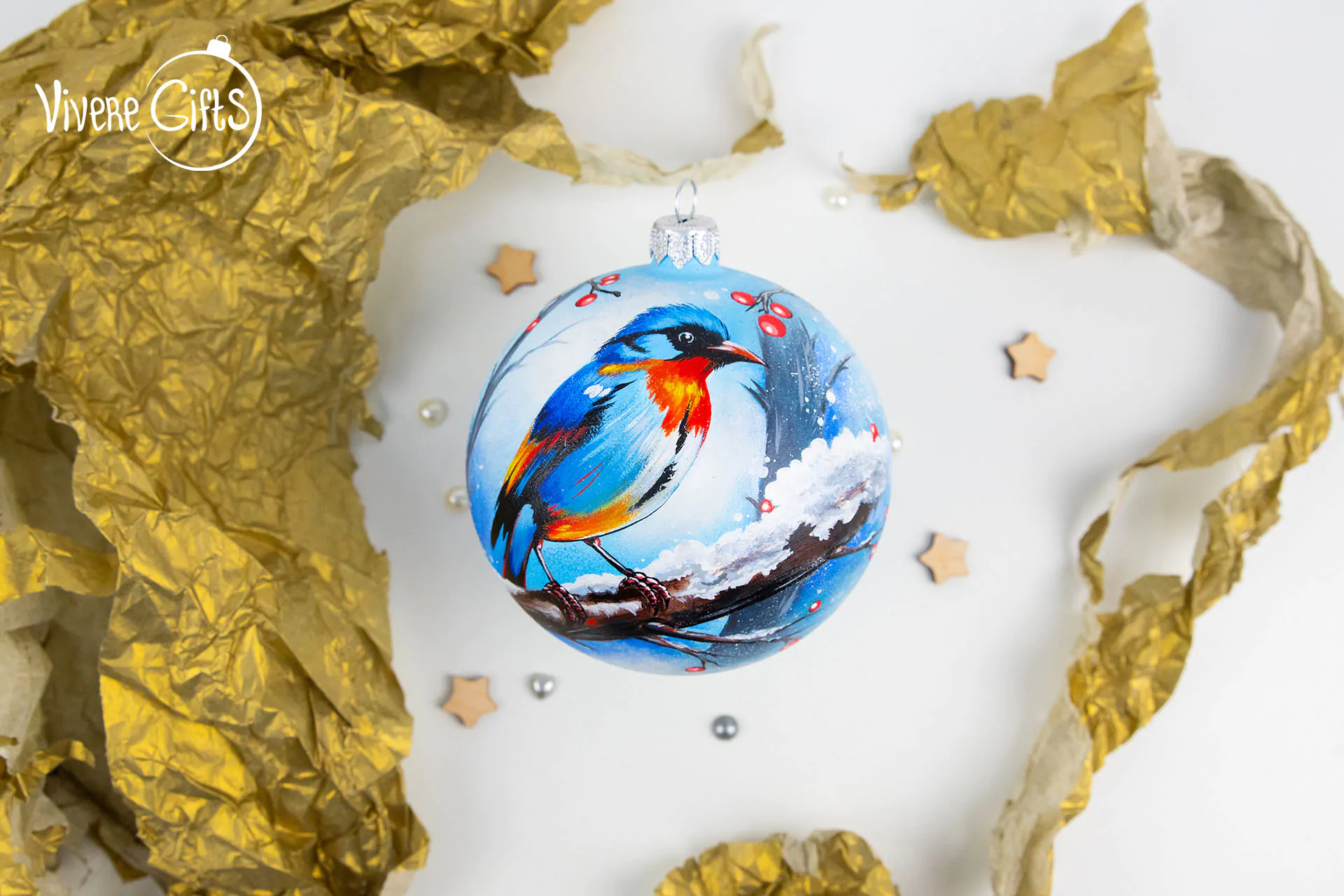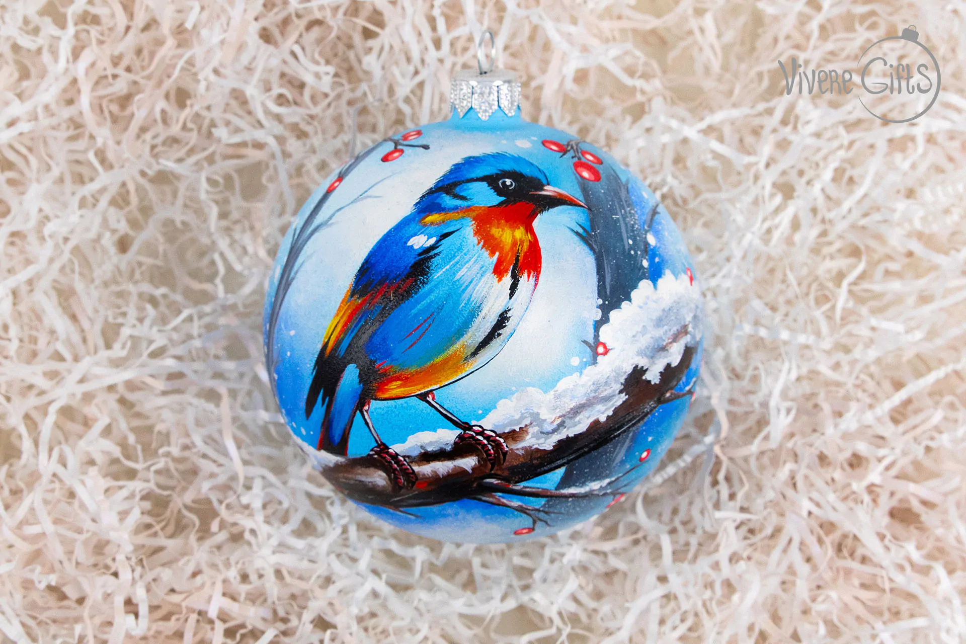 Возможно, именно вы узнаете пеструю птичку, которая изображена на новогоднем шаре с помощью ручной росписи. Композиция получилась очень удачной, яркие цвета выгодно оттеняются более мягкими тонами. Это делает елочный шарик особенным, а ручная роспись – уникальным. Невозможно на 100% повторить рисунок вручную. Всегда будут какие-то мелкие нюансы, именно поэтому ручная работа так ценится.