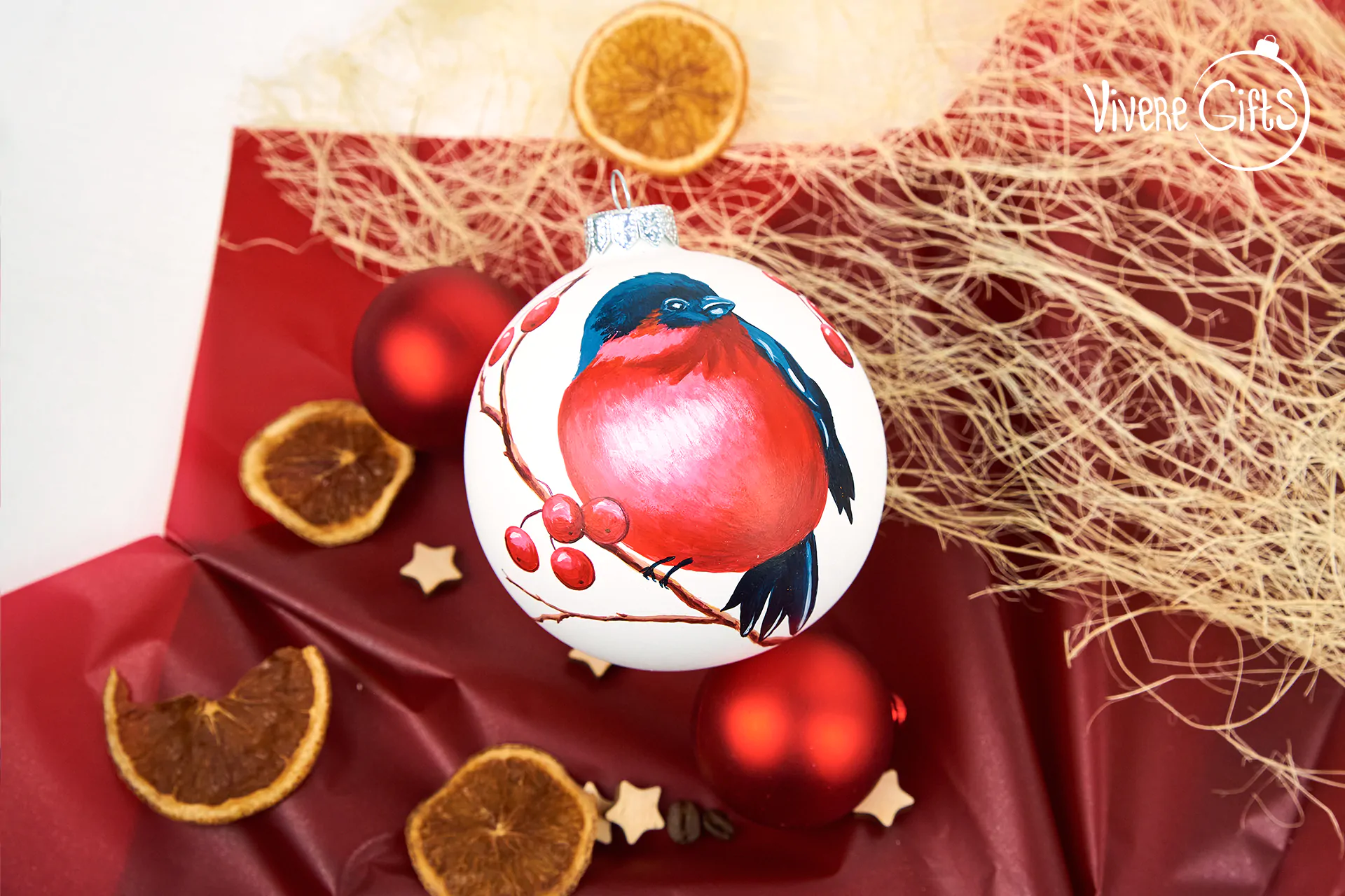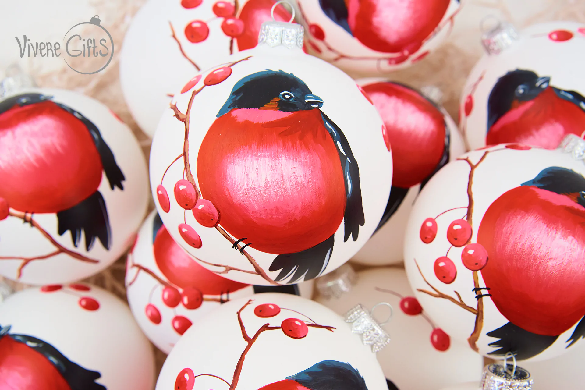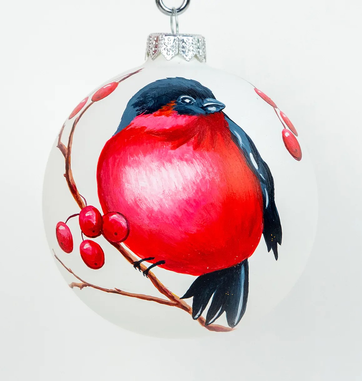 Снегирь на ветке рябины – сюжет, который по праву можно назвать новогодней классикой. Корпоративный елочный шар со снегирем на рябине может быть самостоятельным подарком или стать частью комплекта. Рисунок выполнен вручную на белом матовом шарике, возможно дополнительное нанесение логотипа компании.