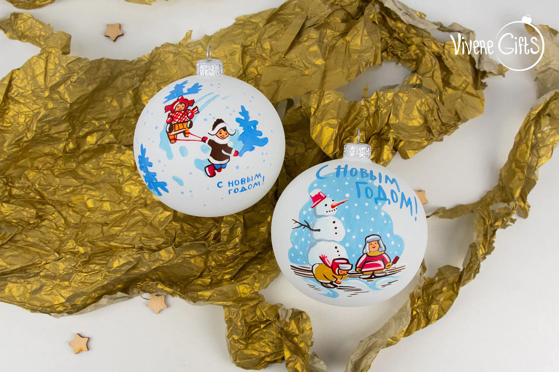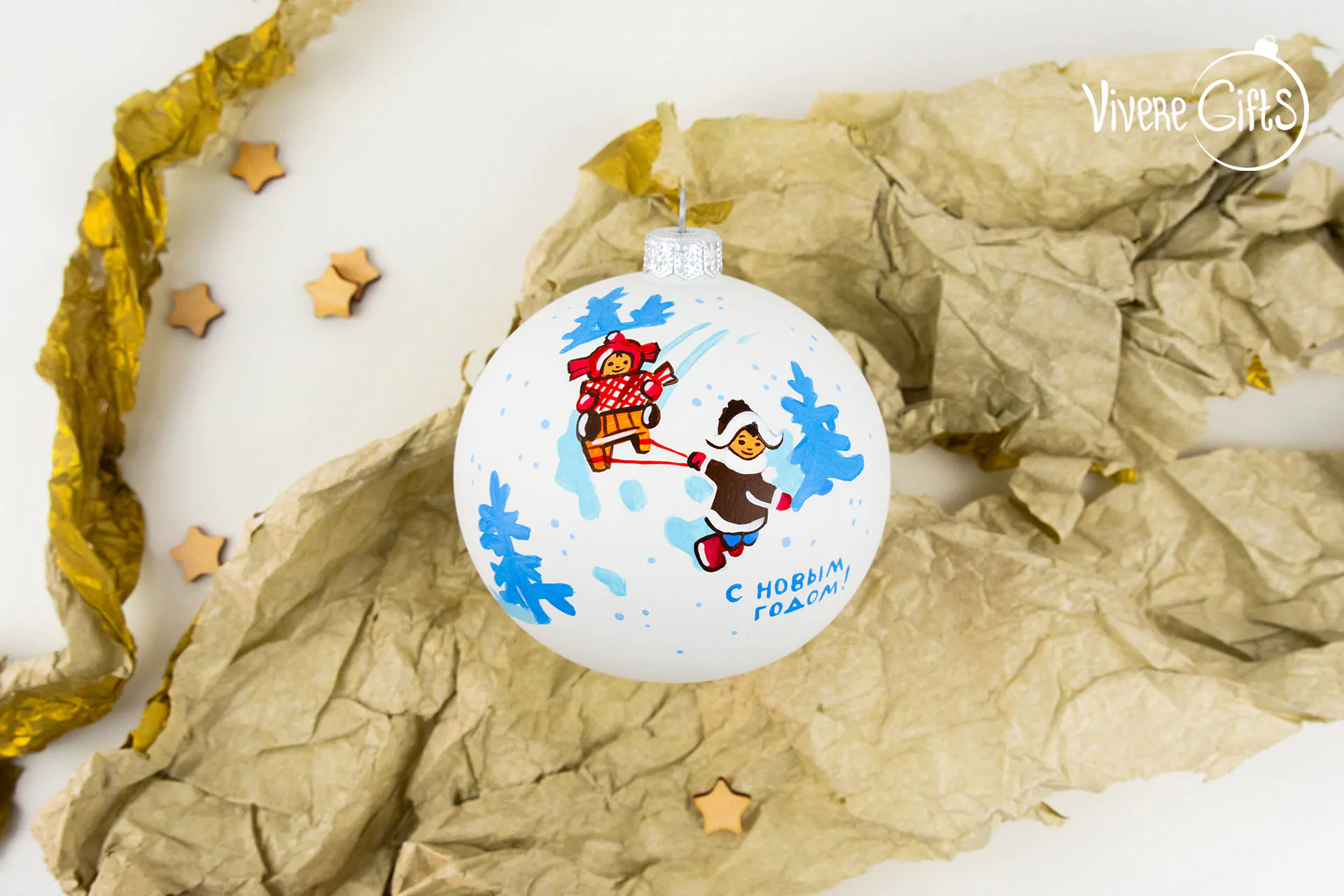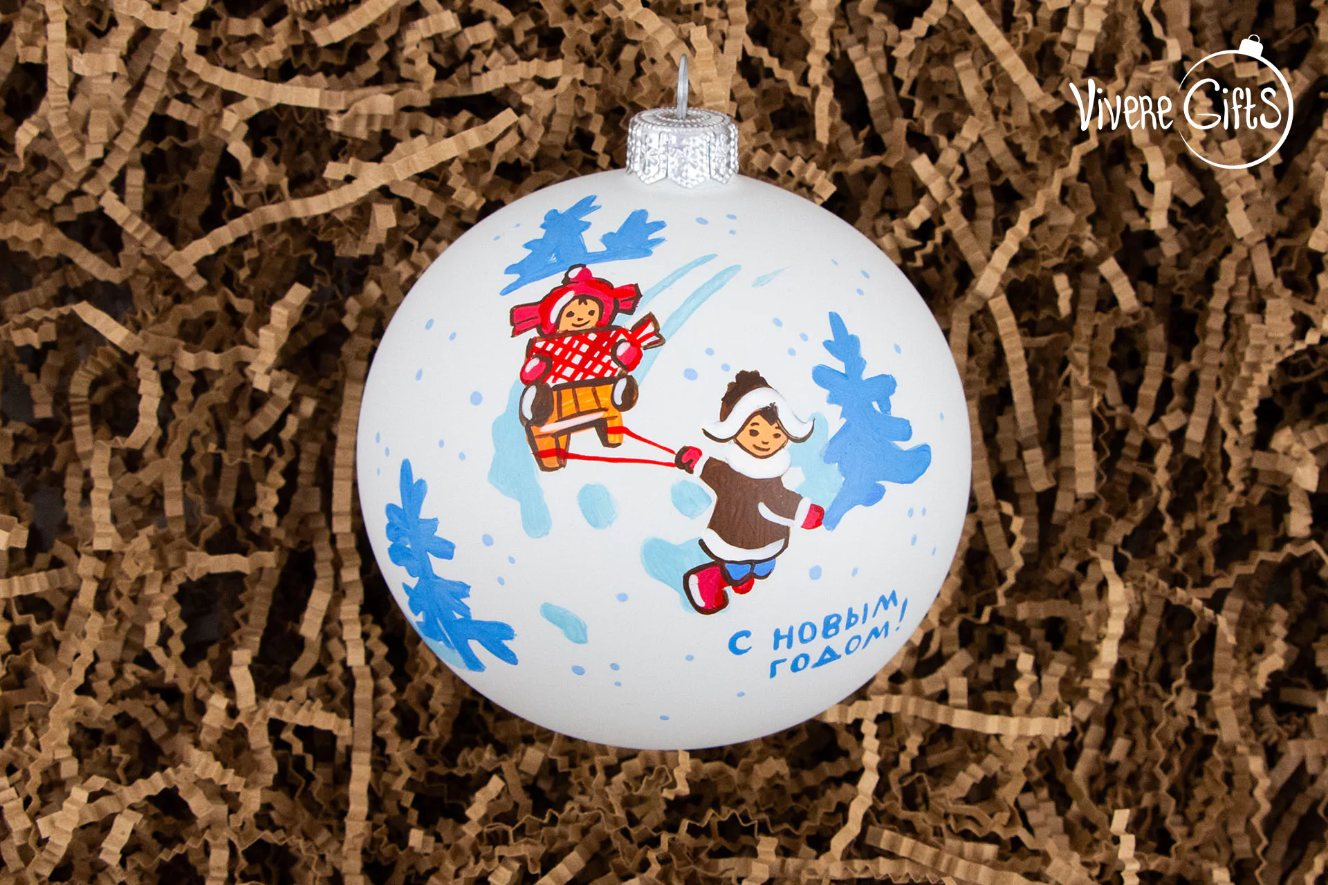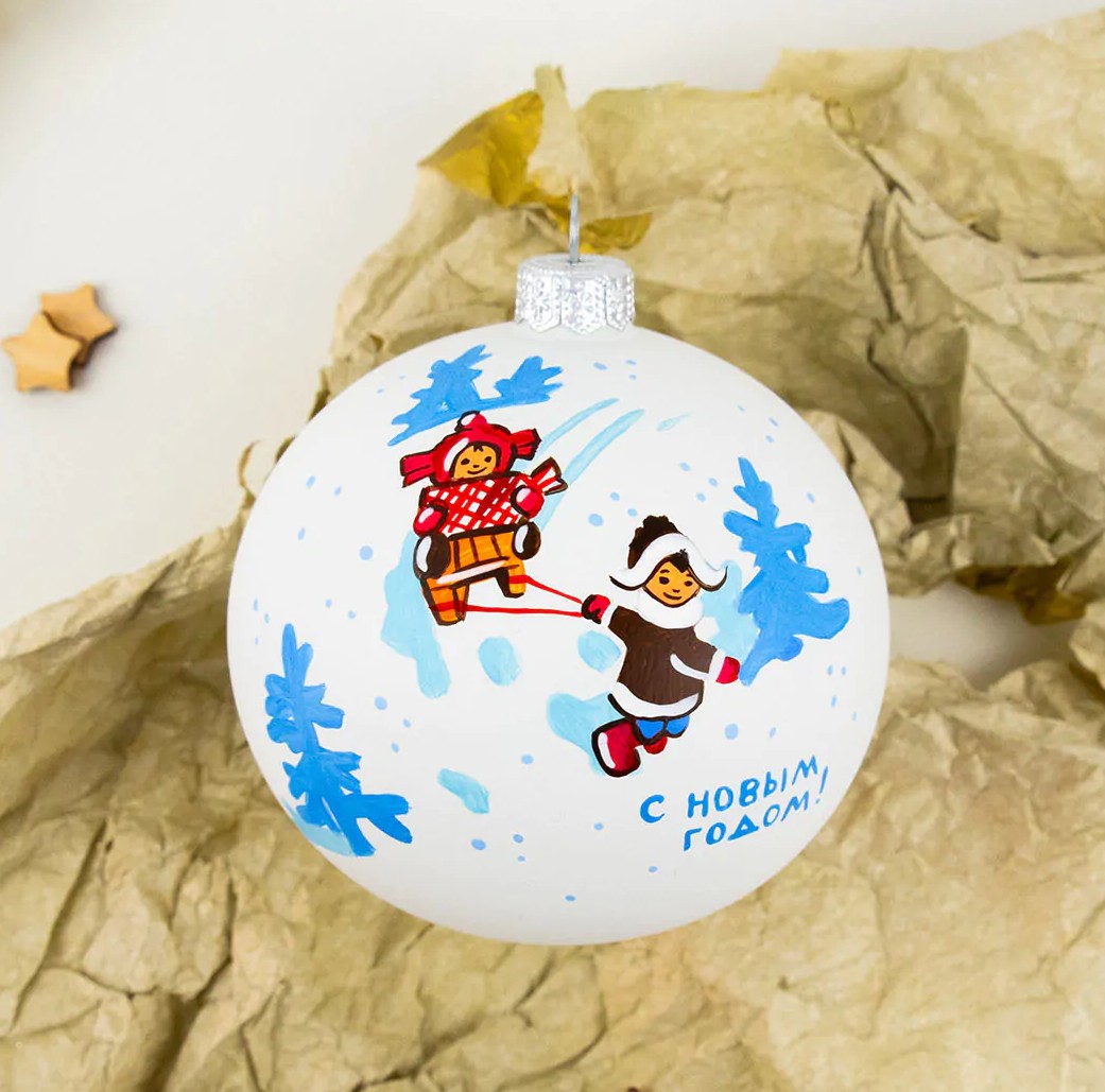В центре сюжетной композиции этого шара изображение детей, которые откровенно веселятся на снежной горке. Мальчик везет на санках свою маленькую сестру и готовится весело съехать на санках вниз. Традиционная детская забава, которая наверняка всколыхнет во многих приятные детские воспоминания о днях, которые мы проводили на горке.