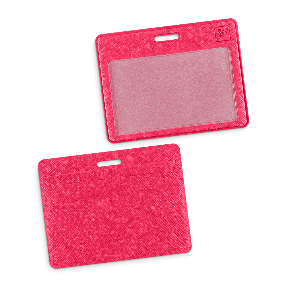 В отличии от простой модели, у этой имеется дополнительный карман для еще одной карты. В верхней части чехла сквозное отверстие под крепление, что позволяет носить его на ленте либо прикрепить к одежде.