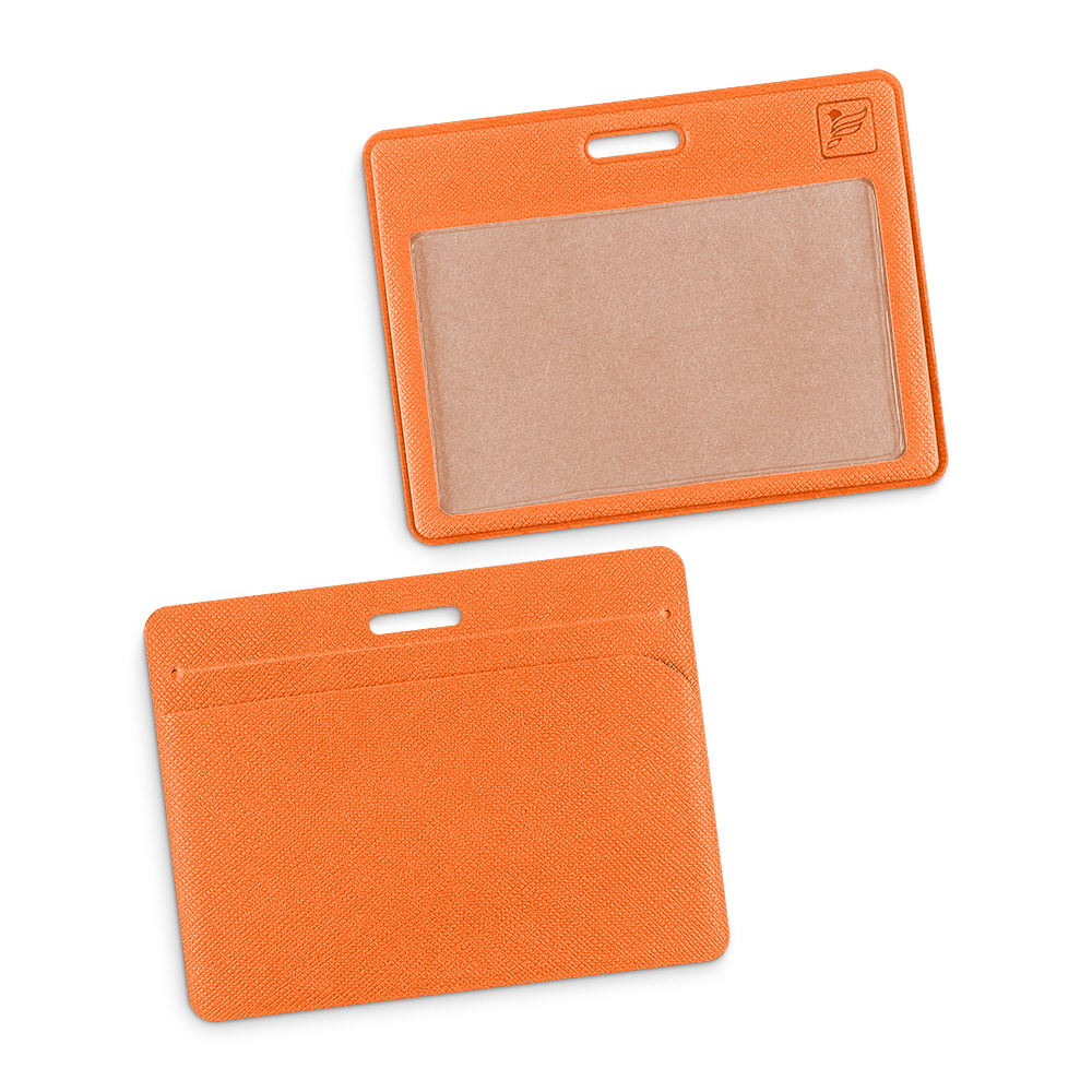В отличии от простой модели, у этой имеется дополнительный карман для еще одной карты. В верхней части чехла сквозное отверстие под крепление, что позволяет носить его на ленте либо прикрепить к одежде.