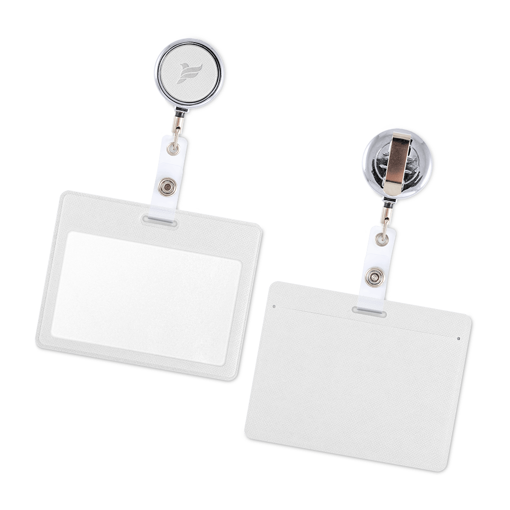 Простой механизм металлического ретрактора зафиксирует чехол для бейджа на одежде или сумке. На ретракторе можно разместить логотип, выполненный блинтовым тиснением — это сделает аксессуар оригинальным.