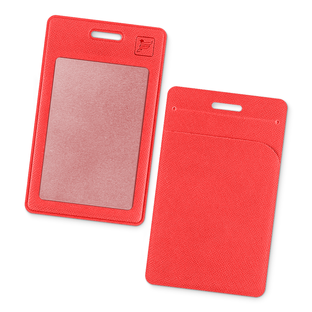 В отличии от простой модели, у этой имеется дополнительный карман для еще одной карты. В верхней части чехла сквозное отверстие под крепление, что позволяет носить его на ленте либо прикрепить к одежде.