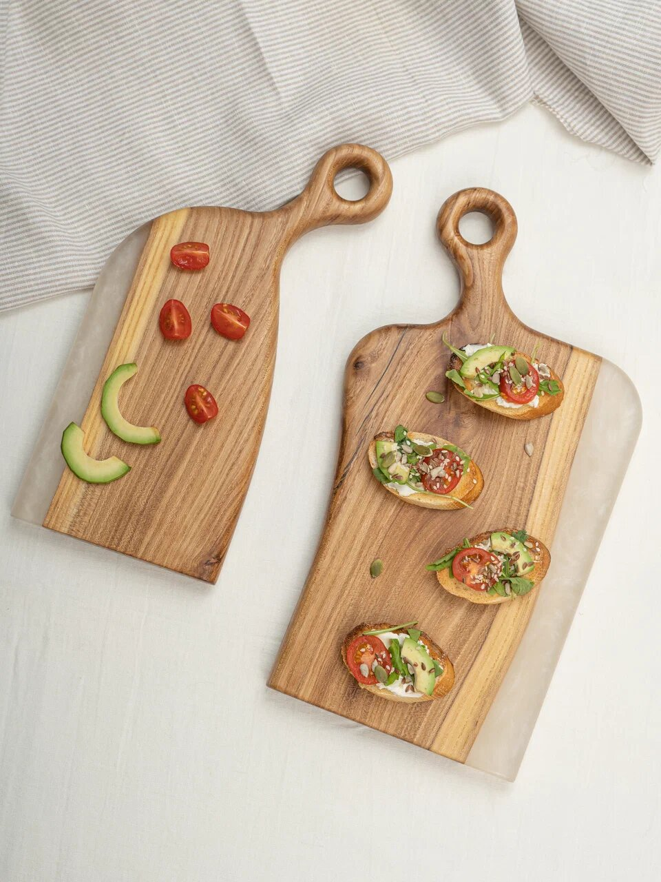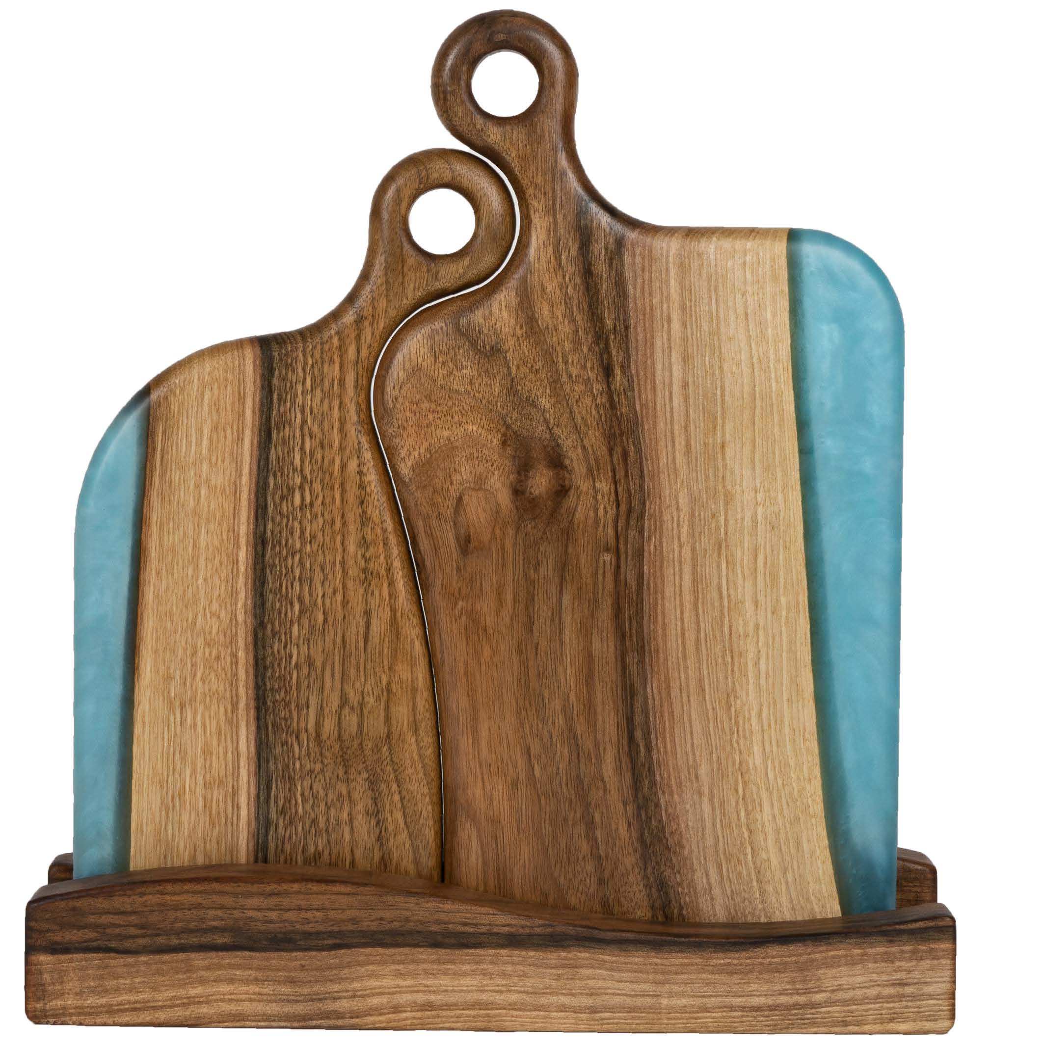 Комплект деревянных досок с оригинальной окантовкой древесины ювелирным полимером придаст яркости вашему кухонному