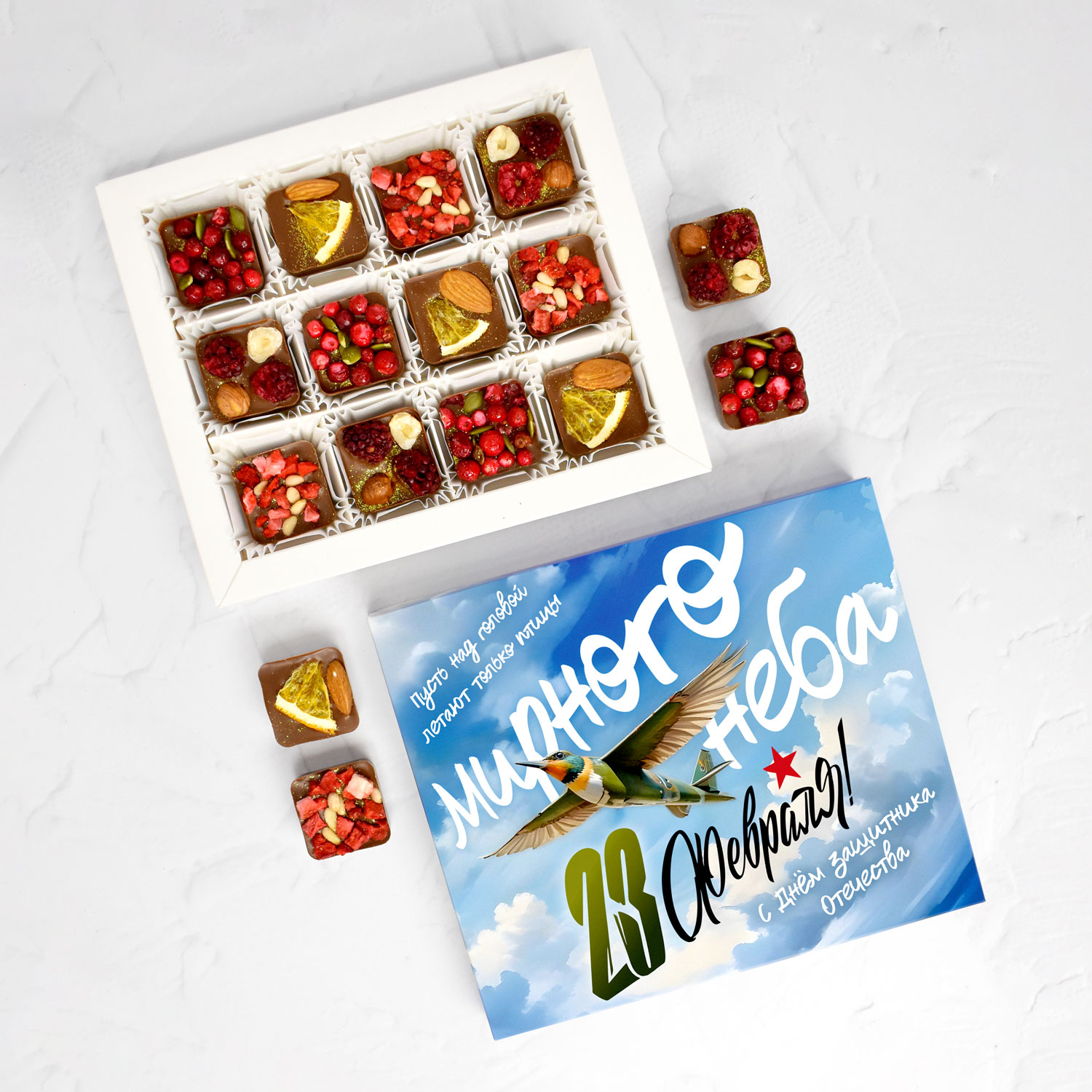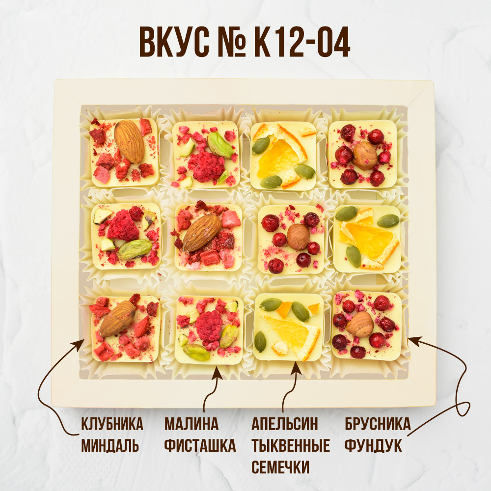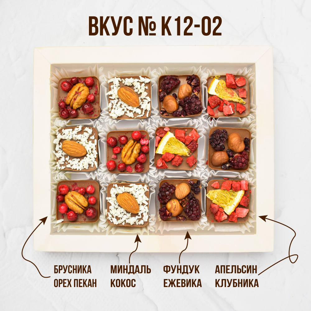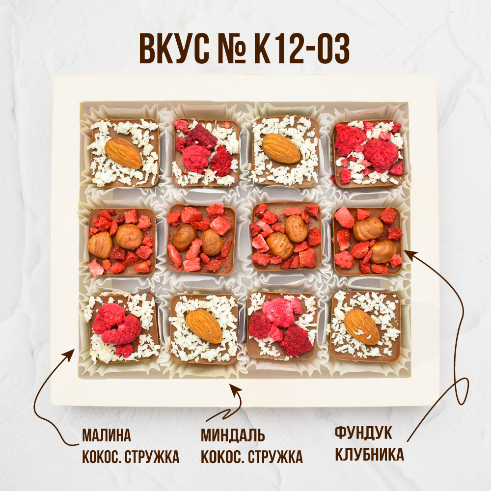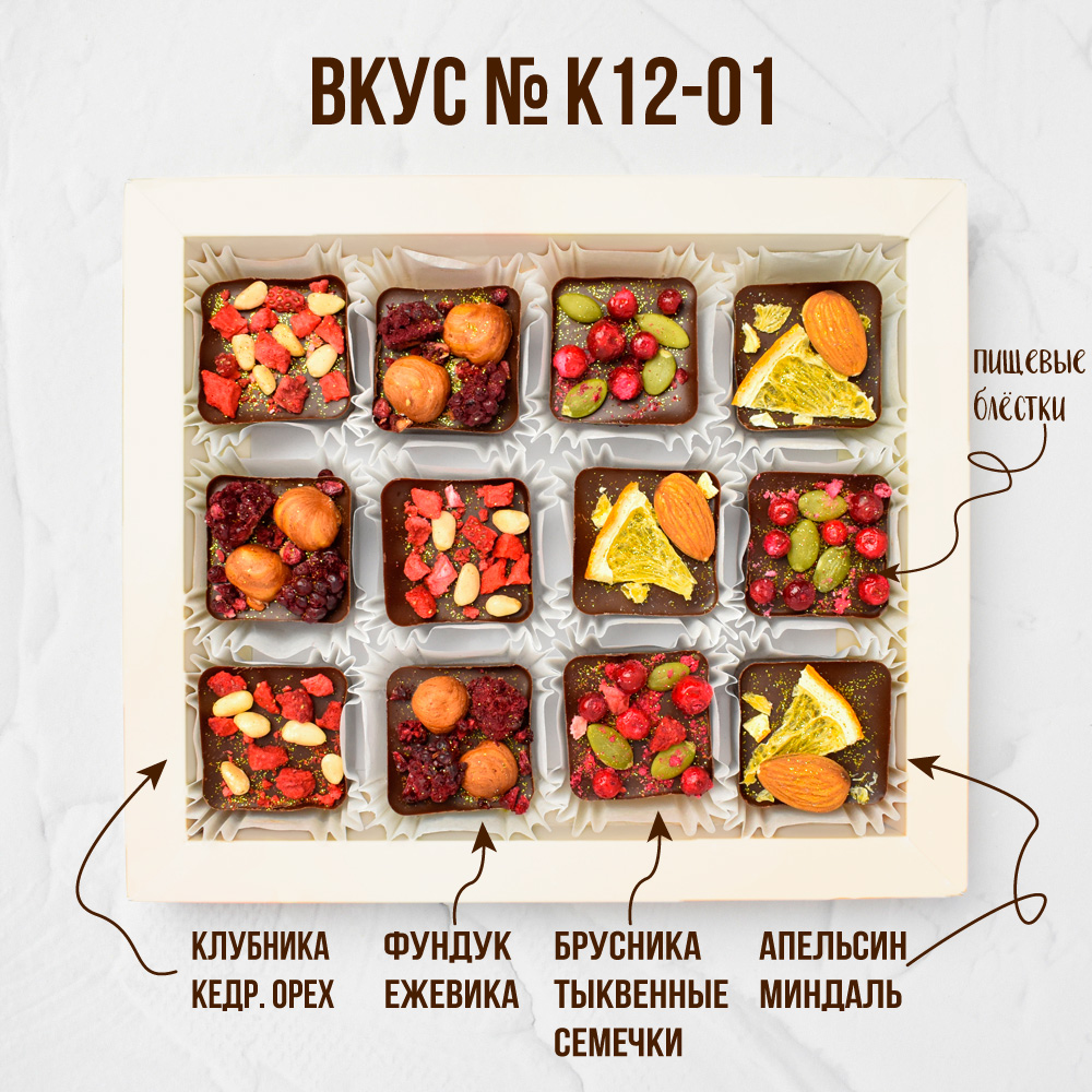 Состав: 12 конфет по 20 гр с наполнением: орехи, сублимированные фрукты и ягоды.