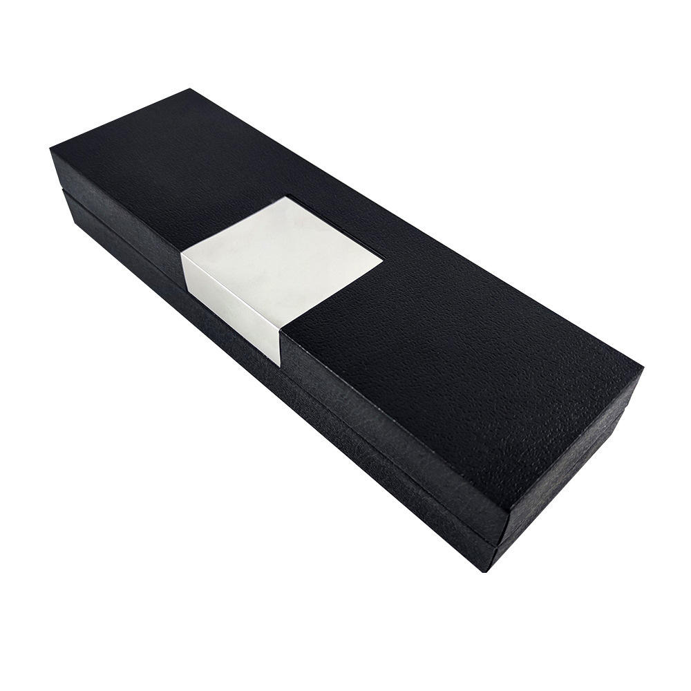 Строгий черный футляр для одной ручки, где геометрия встречается со стилем. Главная деталь — серебристый квадратный элемент, созданный для точечной персонализации.