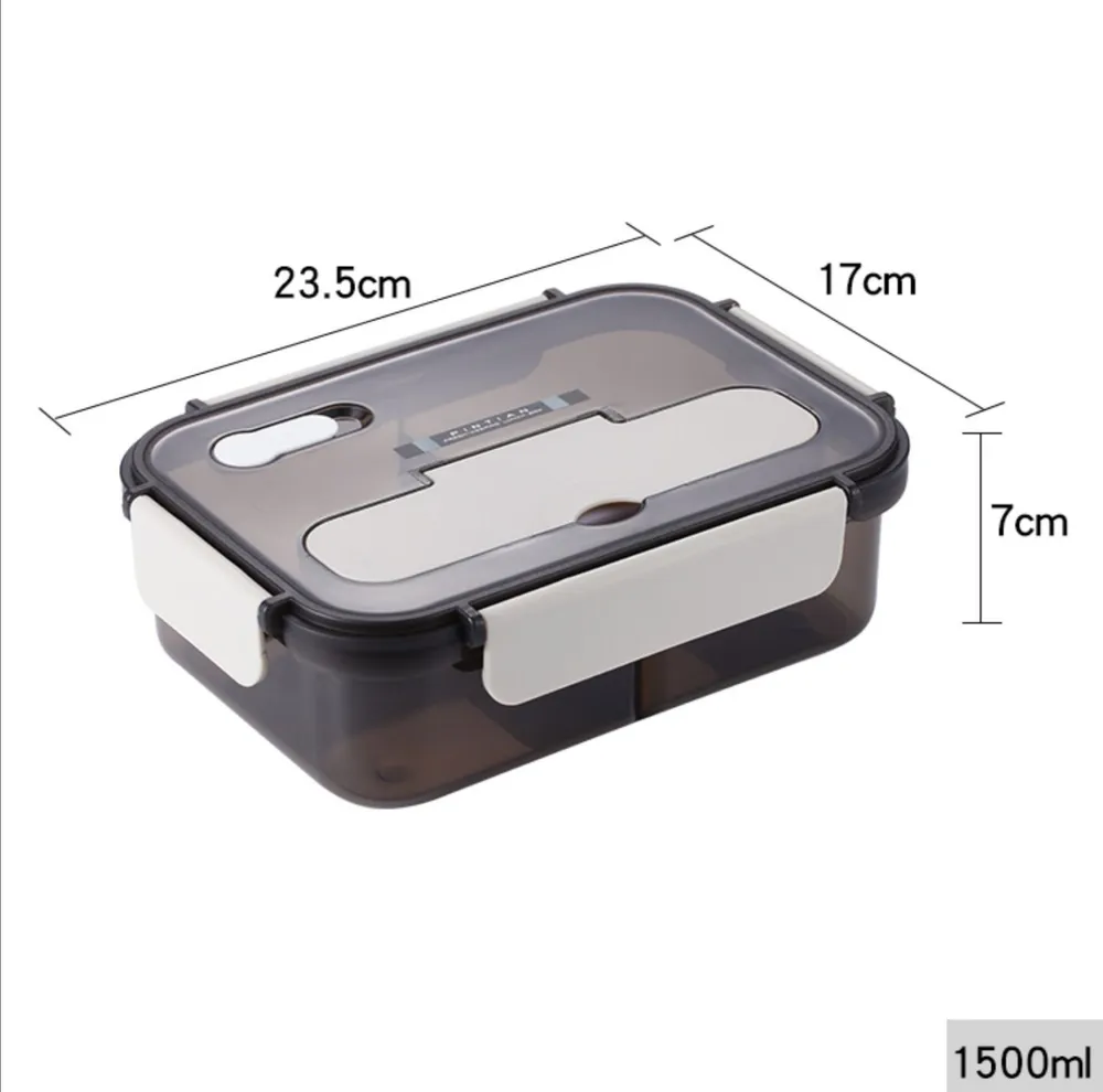 Надоело брать на работу несколько видов пластиковой посуды? Универсальный ланч-бокс с тремя секциями и отделением для столовых приборов заменит сразу три контейнера! Благодаря 3 отсекам ланч-бокс позволяет хранить блюда отдельно друг от друга. Гарнир, горячее и салат в одном контейнере! Также ланч-бокс имеет усиленные защелки, поэтому вы можете быть спокойны — содержимое не испачкает Вашу сумку. Также вы избавитесь от мыслей, куда класть столовые приборы — для этого есть специальный отсек с крышкой, так что приборы останутся чистыми до приема пищи и не испачкают сумку после, данный отсек можно использовать как подставку для телефона. Размер 1500 мл — уместит в себя еду для полноценной и сытной трапезы. Ланч-бокс можно греть в микроволновой печи, мыть в посудомоечной машине, хранить в холодильнике. Дополнительно из столовых приборов в комплект входит ложка и вилка. Идеально вместиться стандартную сумку.