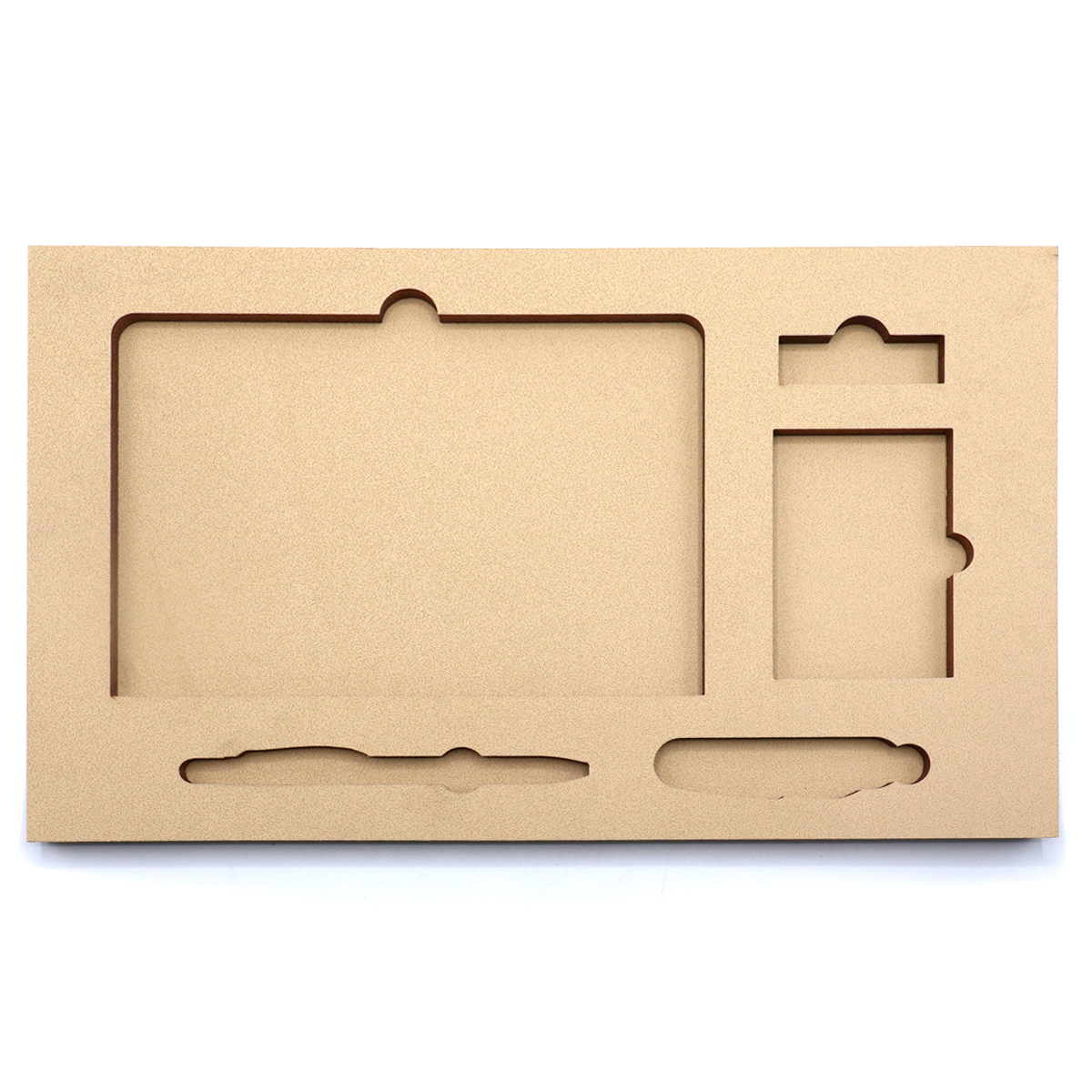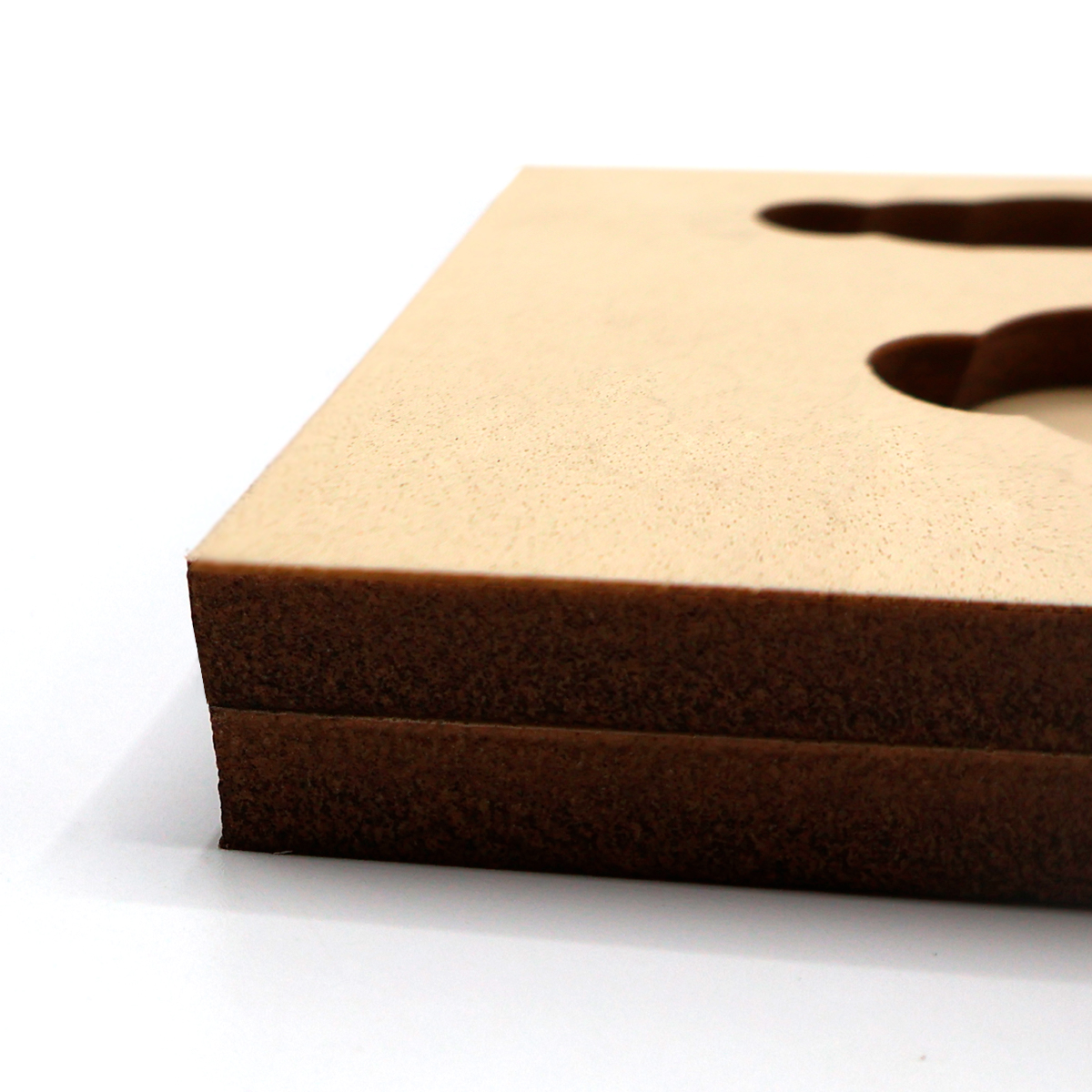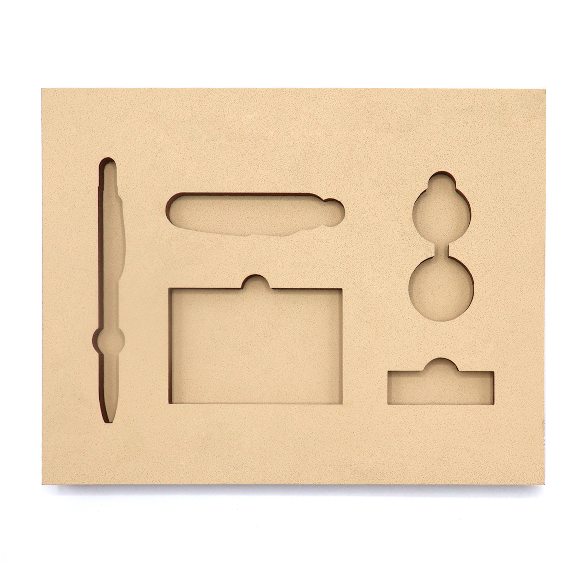 Ложемент, выполненный из бежевого ЭВА материала, представляет собой многослойную конструкцию, состоящую из двух слоев: нижнего толщиной 10 мм и верхнего — 10 мм. Согласно утвержденному макету, проемы для размещения предметов могут быть расположены как в одном, так и в обоих слоях.