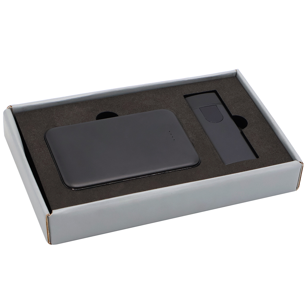 Подарочный набор в стильной цветной картонной коробке серого цвета (крышкой-дно). Внутри на аккуратном ложементе расположены внешний аккумулятор емкостью 5000 mAh и электронная зажигалка. Компактный и мощный внешний аккумулятор обеспечивает надежное подзаряжание мобильных устройств в любое время, а современная электронная зажигалка сочетает в себе удобство и безопасное использование без огня. Этот набор станет практичным и элегантным подарком для людей, ценящих функциональность и стиль.