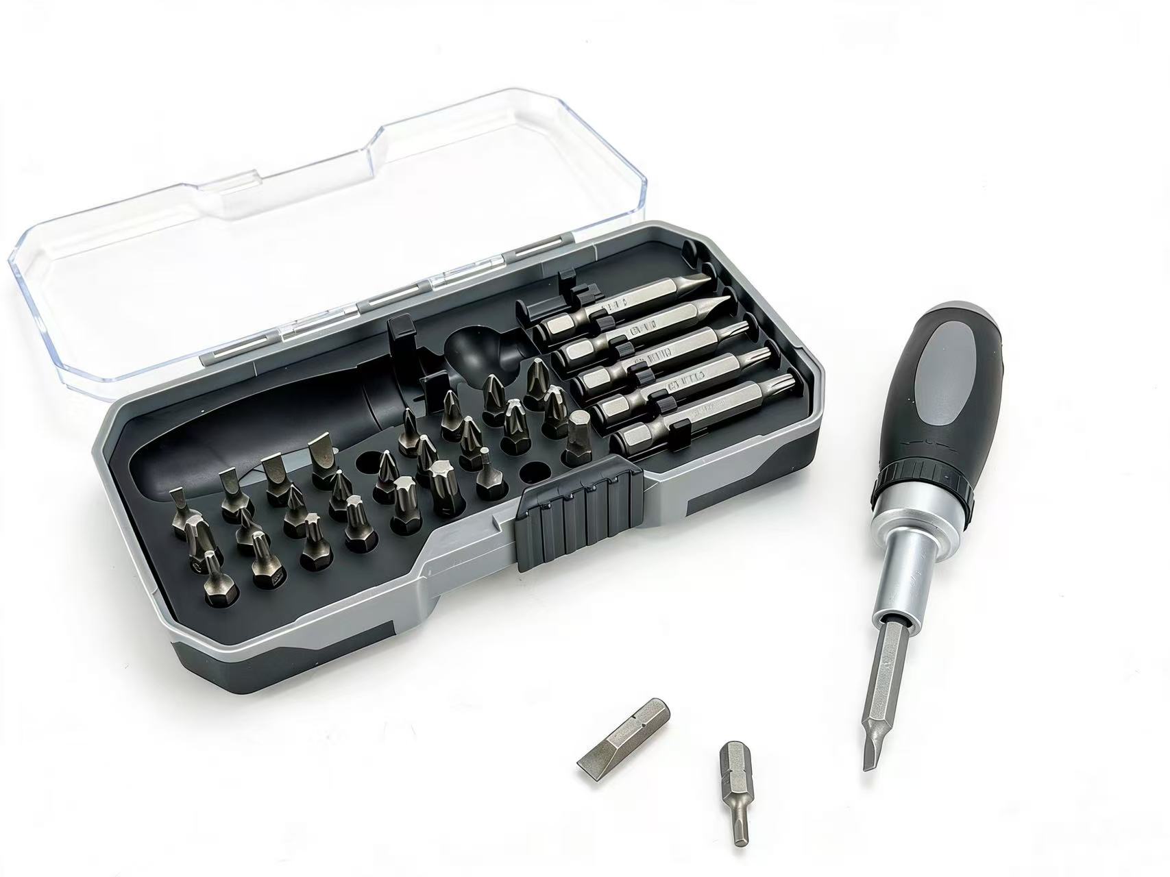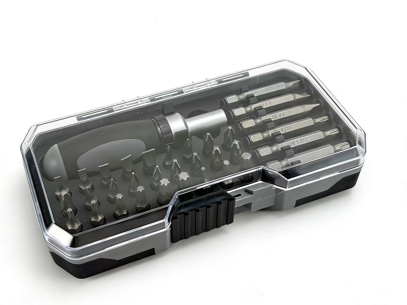 • 27 стандартных бит (25 мм): Плоские (SL3-6), Крестовые (PH0-3, PZ0-3), Шестигранники (H3-6), Звездочки (T10-40), Квадрат (S0-3).
