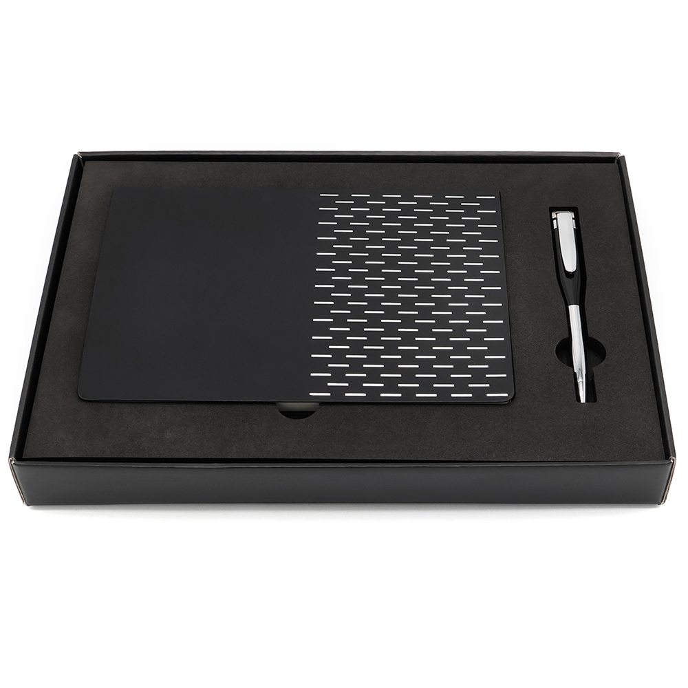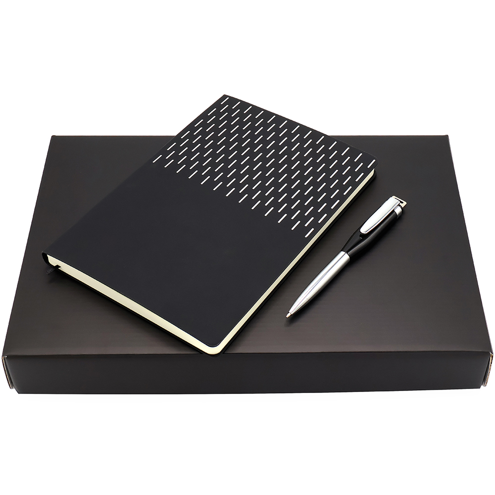 Подарочный набор в стильной цветной картонной коробке черного цвета (крышкой-дно). Внутри на аккуратном ложементе располагаются ежедневник А5 и элегантная металлическая ручка — флешка емкостью 64 ГБ.