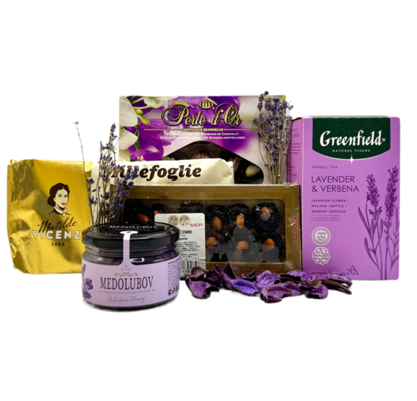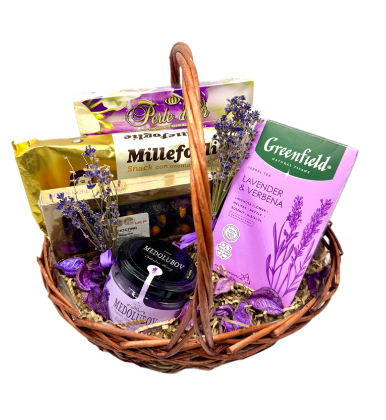 Чернослив с миндалем 150 гр ТМ "ТЕРМЕР-ЭКСТРА" в картонных коробках Мед суфле Медолюбов 250 гр Чай Greenfield Пирамидки Tisane LAVENDER & VERBENA 20 пак. х 1,8 гр Конфеты Дары моря "Перл д'Ор" ЦВЕТЫ 195гр Пирожные слоеные с молочным кремом и белым шоколадом ТМ Vicenzi 100 гр. Корзина натуральная диаметр 30-33 (цвет по наличию) Декор / наполнитель / упаковочные материалы / ленты Сборка набора