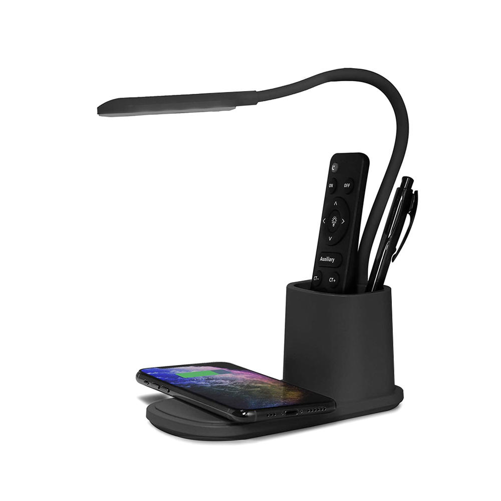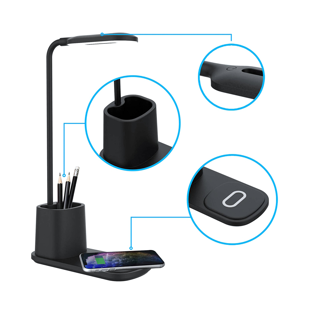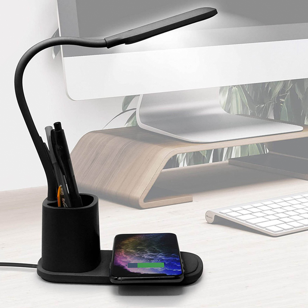 Практичная настольная лампа Tenza для использования в офисе и доме. Стильный лаконичный дизайн и гибкое поворотное регулирование лампы удобно в использовании как на офисном столе, так и прикроватной тумбе. Возможность выбирать степень яркости света несомненный плюс. Держатель для ручек дополняет функциональность. И безусловный лидер популярности – это функция беспроводной зарядки Qi. Тип лампы LED (0.5 x 20 световых диодов. Цветовая температура 3000-6000К). Беспроводная зарядка 10W. Питание: 5V/2A / 100~240V/50-60Hz. В комплекте кабель USB и инструкция. Размер в упаковке: 8,3*11*20,5 см