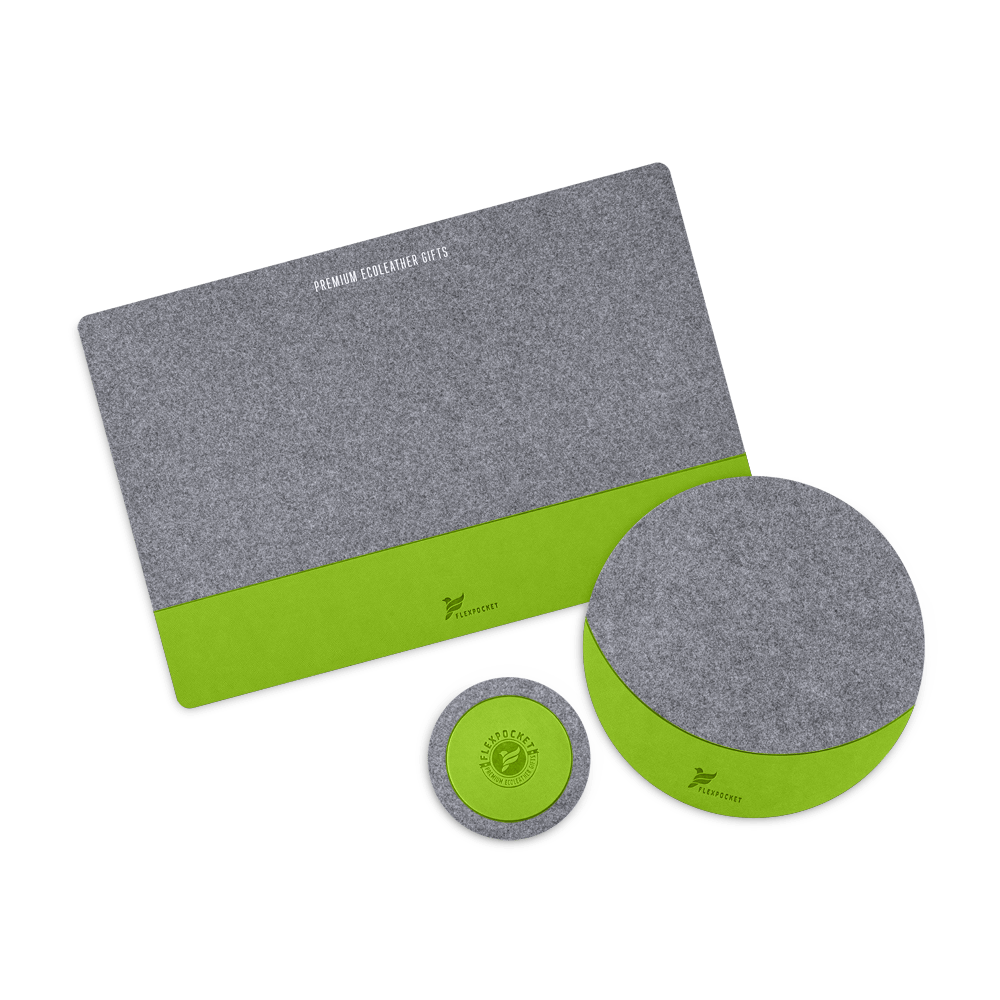 Настольный комплект из фетра состоит из трех предметов: небольшой подкладки для клавиатуры, стильного коврика для любой компьютерной мышки и подставки под кружку (coaster). Брендированный комплект не только защитит поверхность рабочего стола, но и станет отличным вариантом для размещения ненавязчивой рекламы вашей компании.
