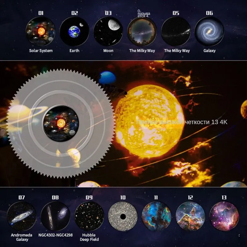 Вы действительно можете дотянуться до звезд! Вас ждут 13 уникальных проекций, включая изображения созвездий, астероидов, планет и космоса в высоком разрешении. Ночник максимально прост в использовании: подключите к сети ночник-проектор через USB кабель, настройте фокусное расстояние, скорость вращения и наслаждайтесь великолепным и реалистичным космосом прямо у вас дома! Чтобы сменить изображение — извлеките слот и поменяйте кардридж по вашему настроению. Также вы можете регулировать угол наклона ночника-проектора и менять скорость вращения для более живого восприятия. Космос ночник оснащен светодиодной LED-лампой большой мощности. Ее свечение визуально расширит пространство вашей комнаты и создаст невероятную космическую атмосферу! Погружайтесь в мир космоса с семьей или друзьями, изучая созвездия и планеты. Ночник проектор подарит мечты о космосе для ваших детей и позволит им фантазировать о покорении этих бескрайних космических просторов! Ночник проектор звездное небо создаст вам настоящий домашний планетарий, который вы не захотите покидать! Вы сможете расположить его где угодно, будь то детская комната, гостиная или кухня — он подарит любой комнате уютную обстановку и возможность для релаксации и медитаций.