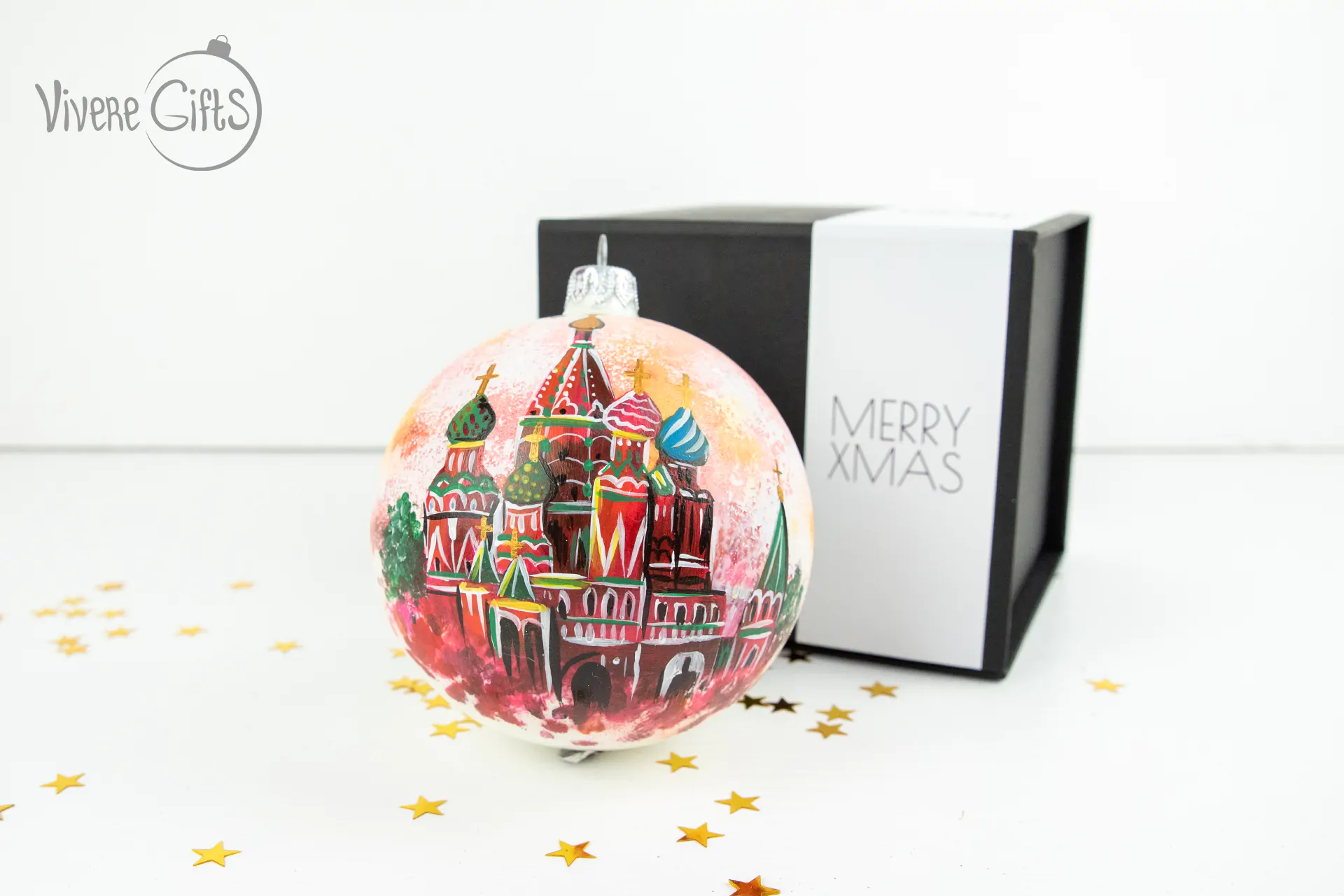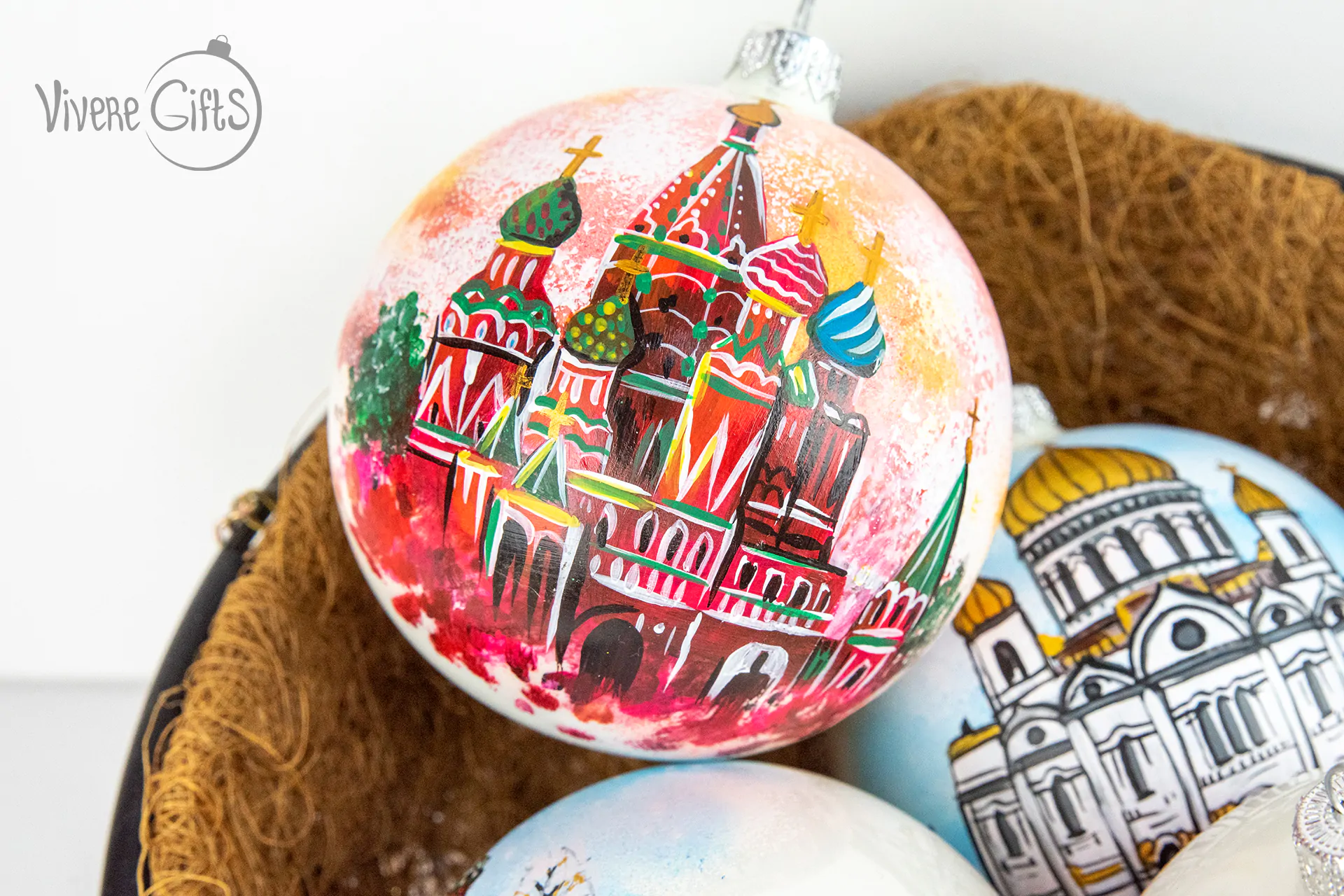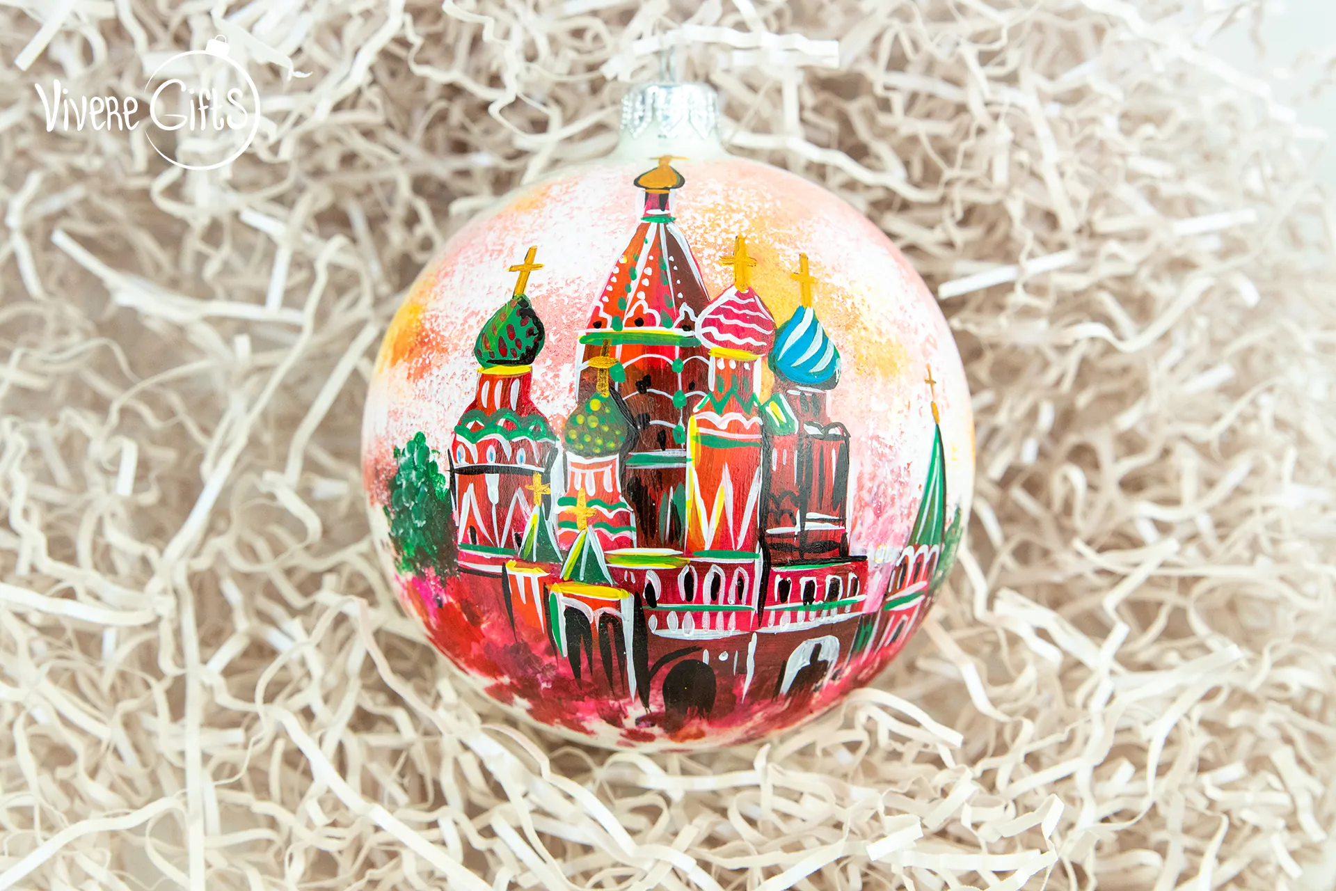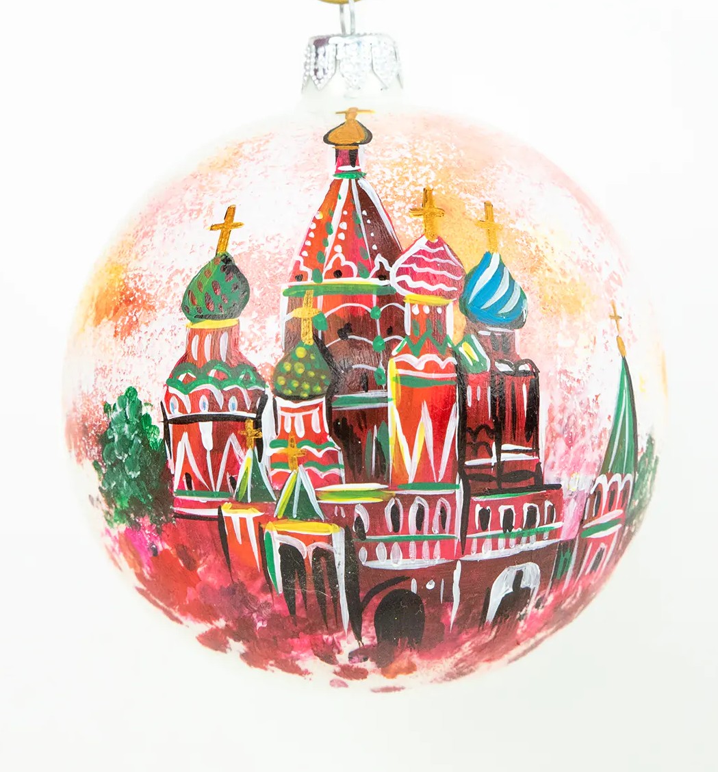 Новогодние шары – это отличный вариант для арт адаптации Храма Василия Блаженного. Иногда кажется, что храм специально строили для того, чтобы его изображение появлялось на сувенирной продукции из России. Яркий, будто игрушечный, храм расположен в самом сердце России – на Красной площади в Москве. Поэтому новогодние шары, на которых изображен Храм Василия Блаженного, отлично подойдут всем, кому близка тема России, православия и всемирно известных достопримечательностей.