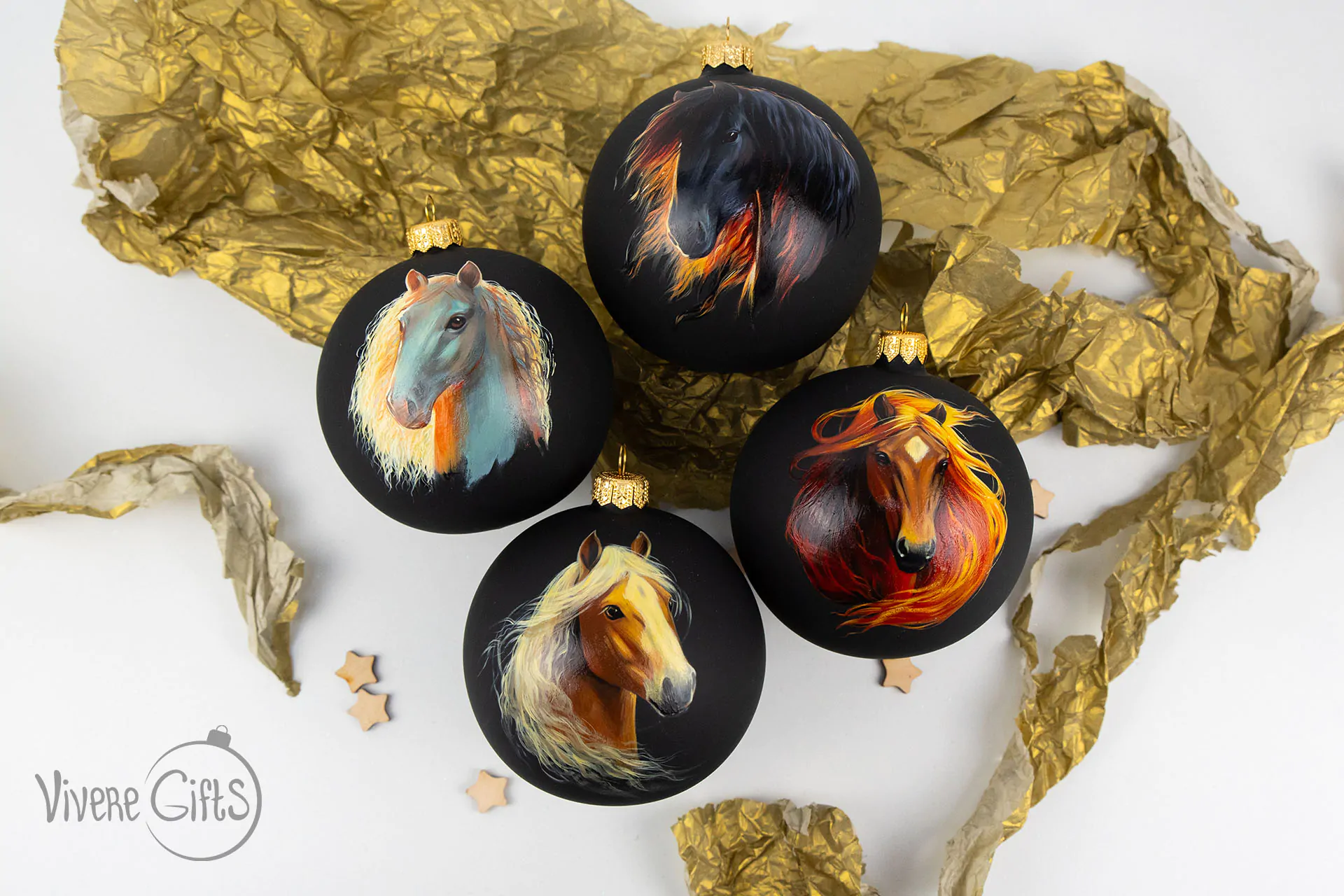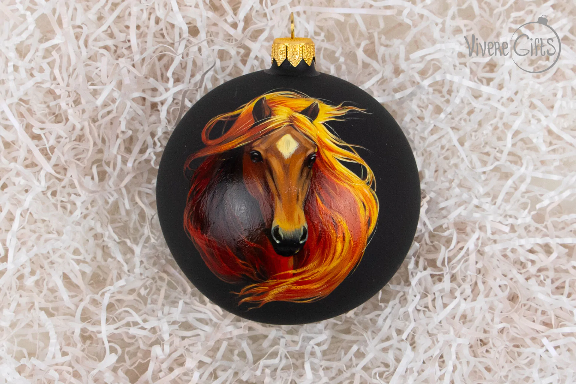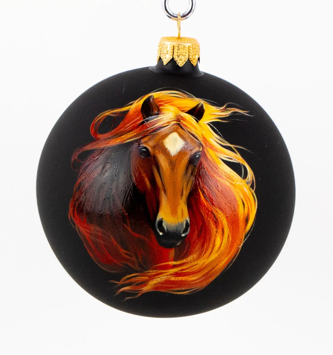 Рыжий конь – это символ скорости, огня и движения. На новогоднем шаре с ручной росписью рыжий конь буквально рвется вперед и своей энергией заряжает всех окружающих. Шарик с изображением рыжей лошади выполнен односторонней ручной росписью по голью, на рисунке глянцевый лак, черный фон остается матовым, что добавляет изображению глубины.