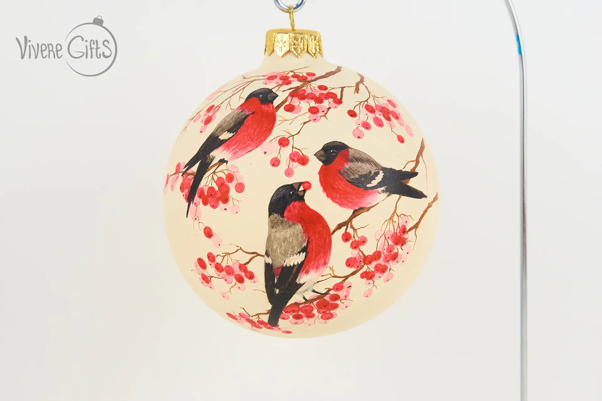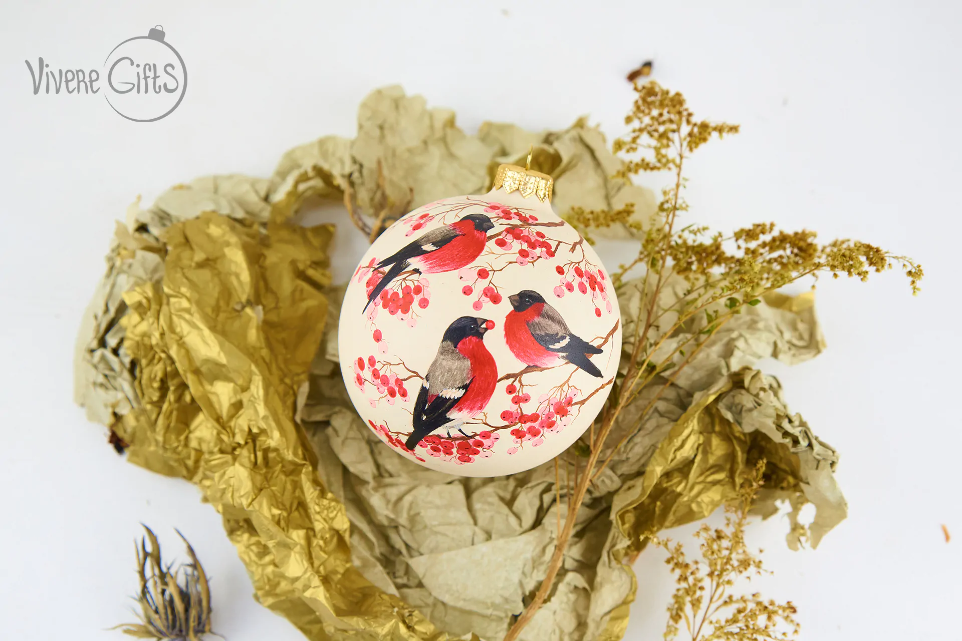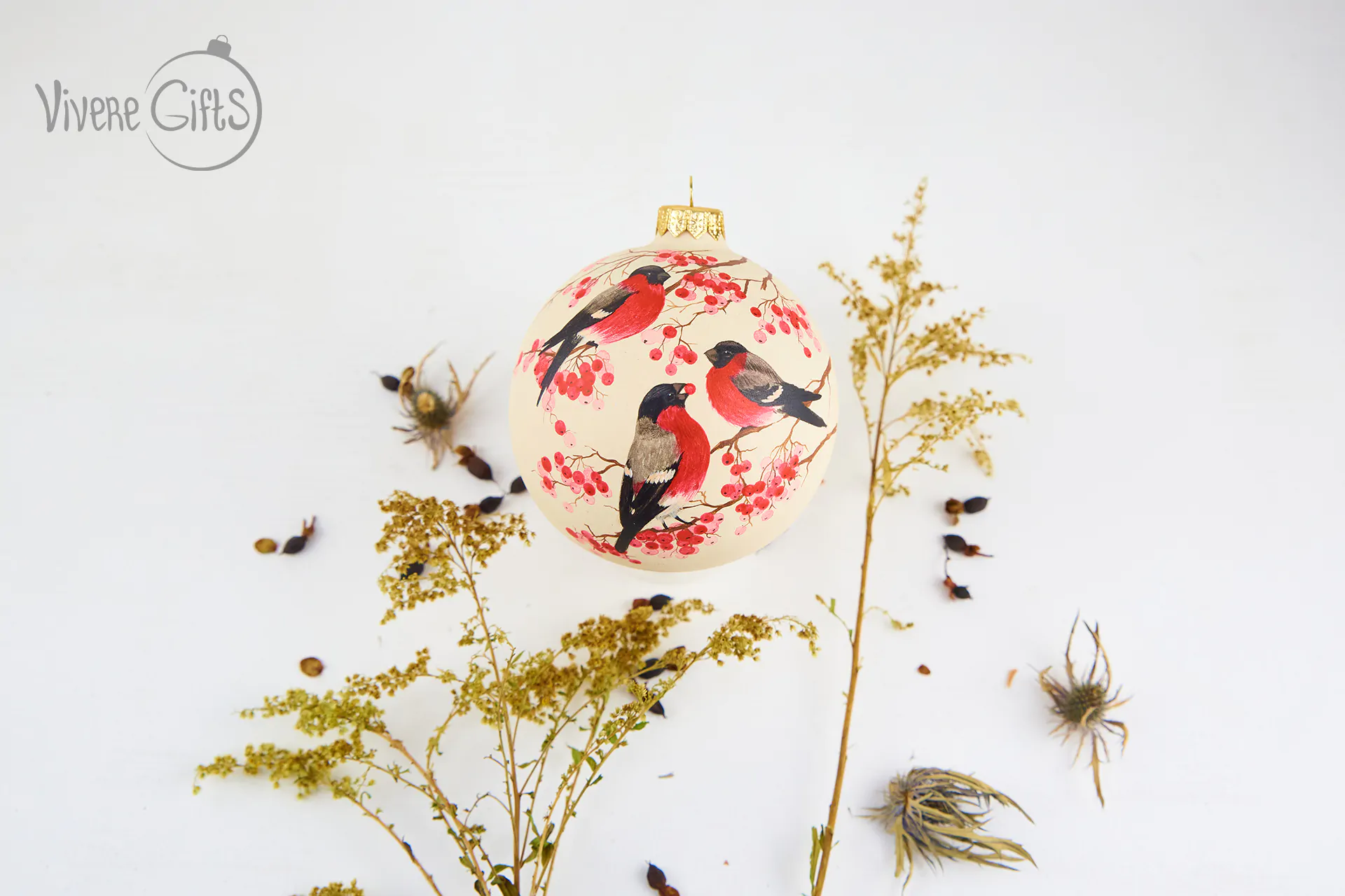 Елочные шары с необычной композицией в китайском стиле, односторонняя ручная роспись выглядит очень привлекательно, картинку хочется рассмотреть поближе. Корпоративный новогодний шар протонирован по всей диагонали в нежный бежевый цвет. Изображение можно дополнить логотипом вашей компании.