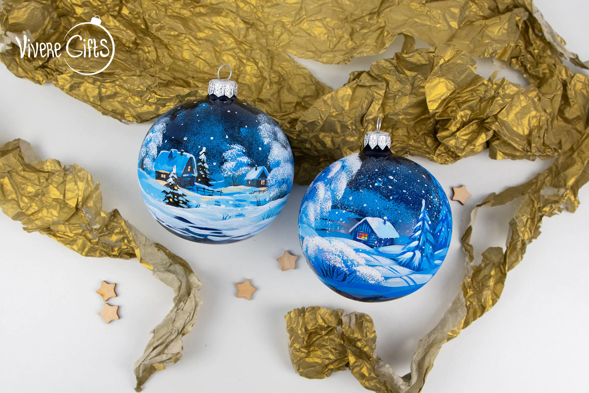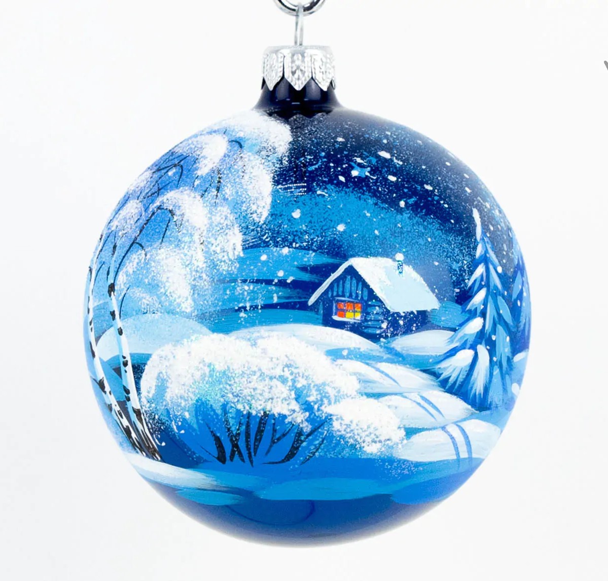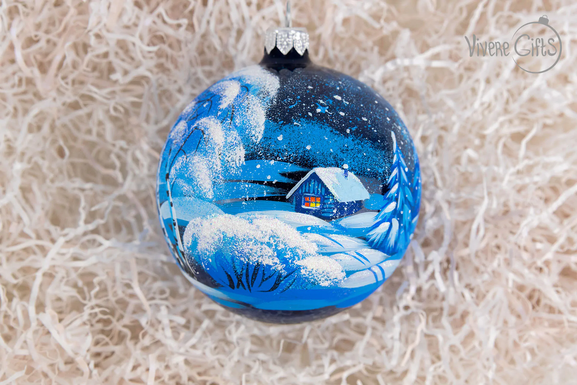Елочный шарик с ручной росписью получил романтическое название Свет в окне. И это во многом отражает замысел художника. В морозную зимнюю ночь (об этом говорит ясное небо), в лесу, так важно видеть свет окна, который символизирует тепло, безопасность и надежду. При этом шарик получился мягким и холодным одновременно, картина заставляет задуматься и переоценить многое из того, что у нас есть здесь и сейчас. Каждый в елочном шаре ручной росписи с изображением зимнего домика найдет что-то своё.