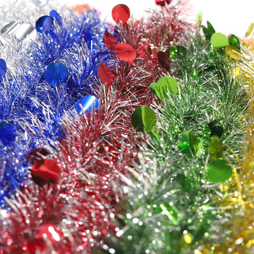 Праздничную атмосферу Нового года создаст новогодняя мишура своими яркими цветами (синий, красный, золотой, серебристый, зелёный) и неповторимым шуршащим звуком. Блёстки мишуры добавят красок вашему празднику.