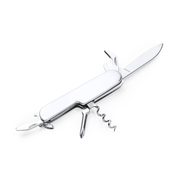 Многофункциональный нож из нержавеющей стали с 6 функциями: нож, открывалка для бутылок, консервный нож, штопор, отвертка и кольцо для ключей.