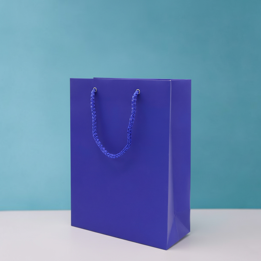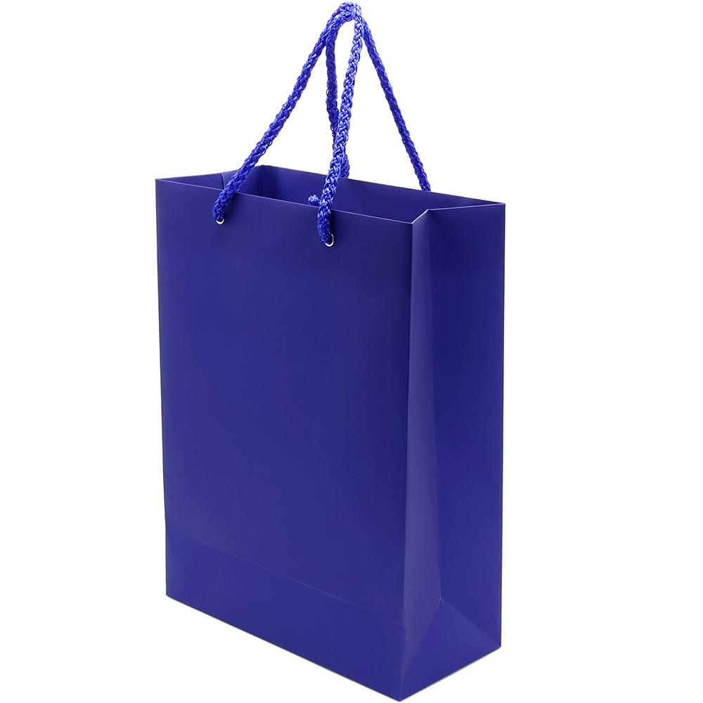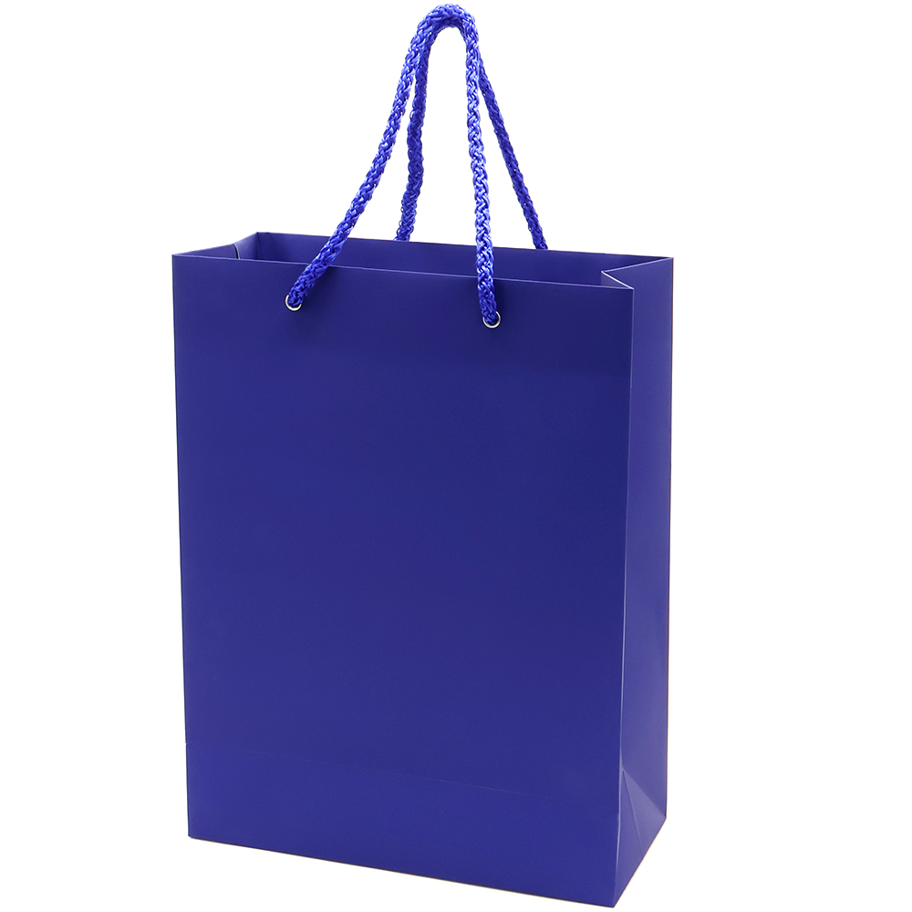 Бумажный пакет плотностью 170 г/м². Покрытие софт-тач. Шнур 6 мм синего цвета. Люверс — серебристый.