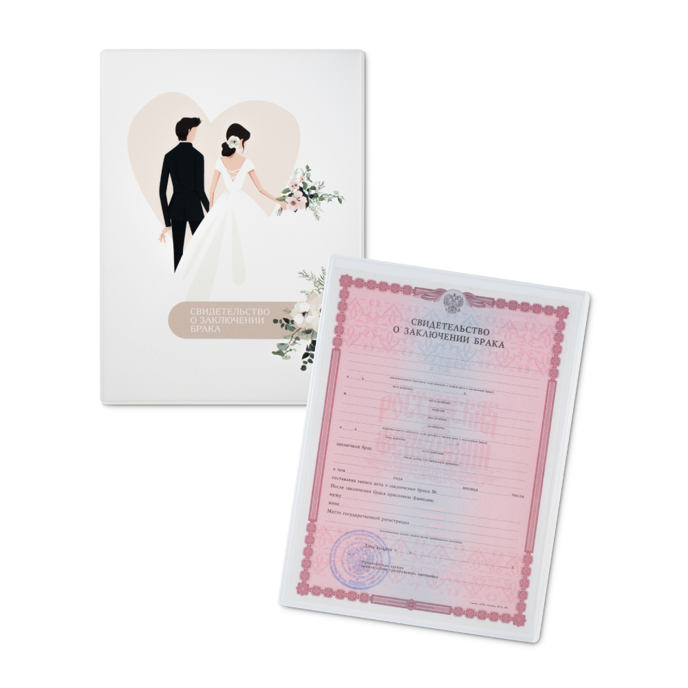 Обложка предназначена для хранения свидетельства о регистрации брака формата А5. Папка размером 19,6 x 26,6 см изготовлена из приятного на ощупь материала — высококачественной экокожи. На лицевую сторону возможно нанесение печати с изящным рисунком, а с оборотной стороны плотный пластиковый карман, который защитит ваш первый семейный документ от механических повреждений. Прозрачность кармана позволяет прочесть данные документа, не вытаскивая его из обложки. Благодаря компактности свидетельство о браке удобно брать с собой. Интересный дизайн папки с печатью станет оригинальным дополнением к подарку для новобрачных на свадьбу, супругам на годовщину или венчание. Вмещает свидетельство о заключении брака старого образца формата А5.