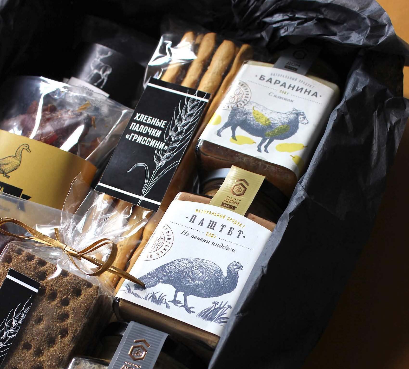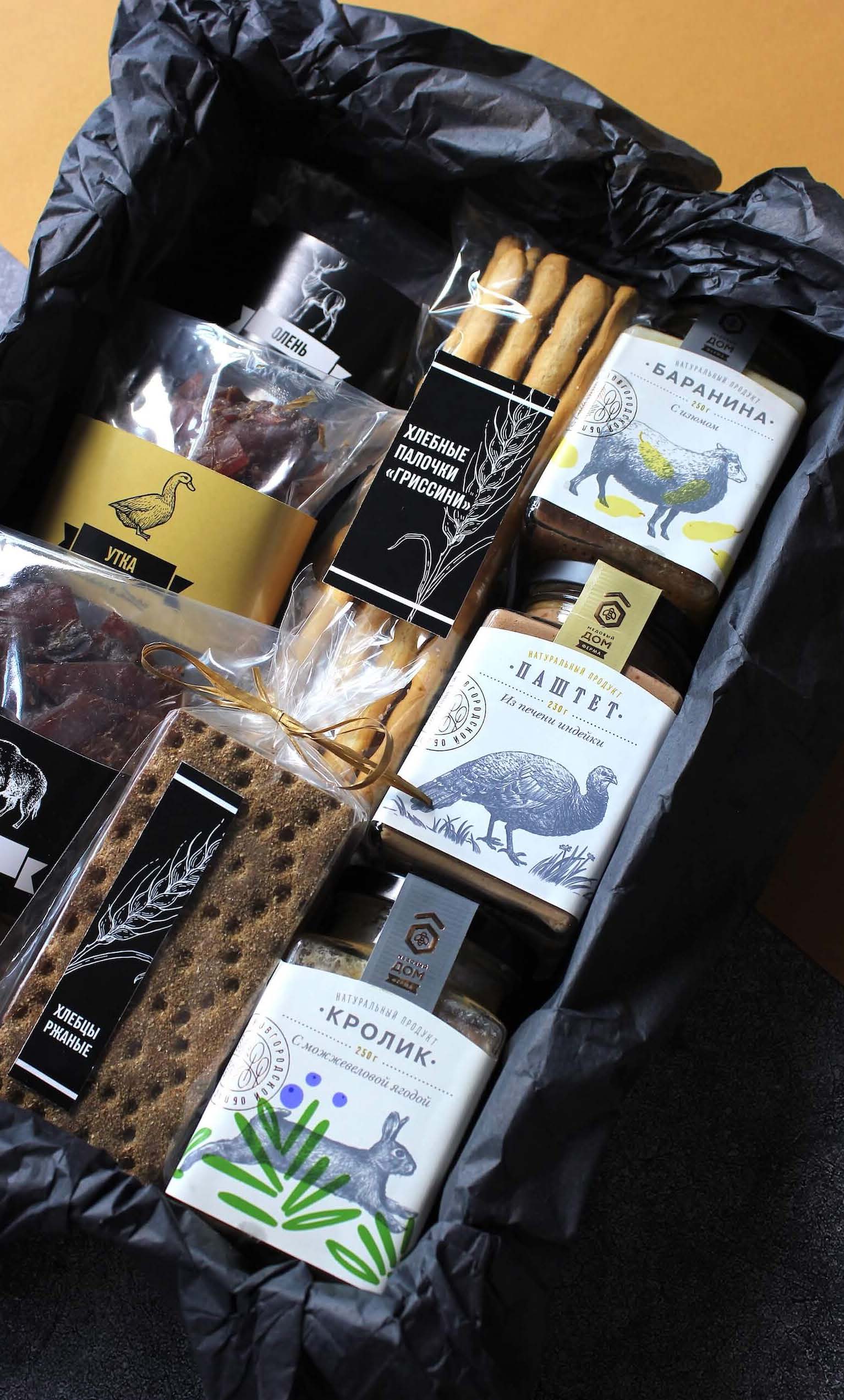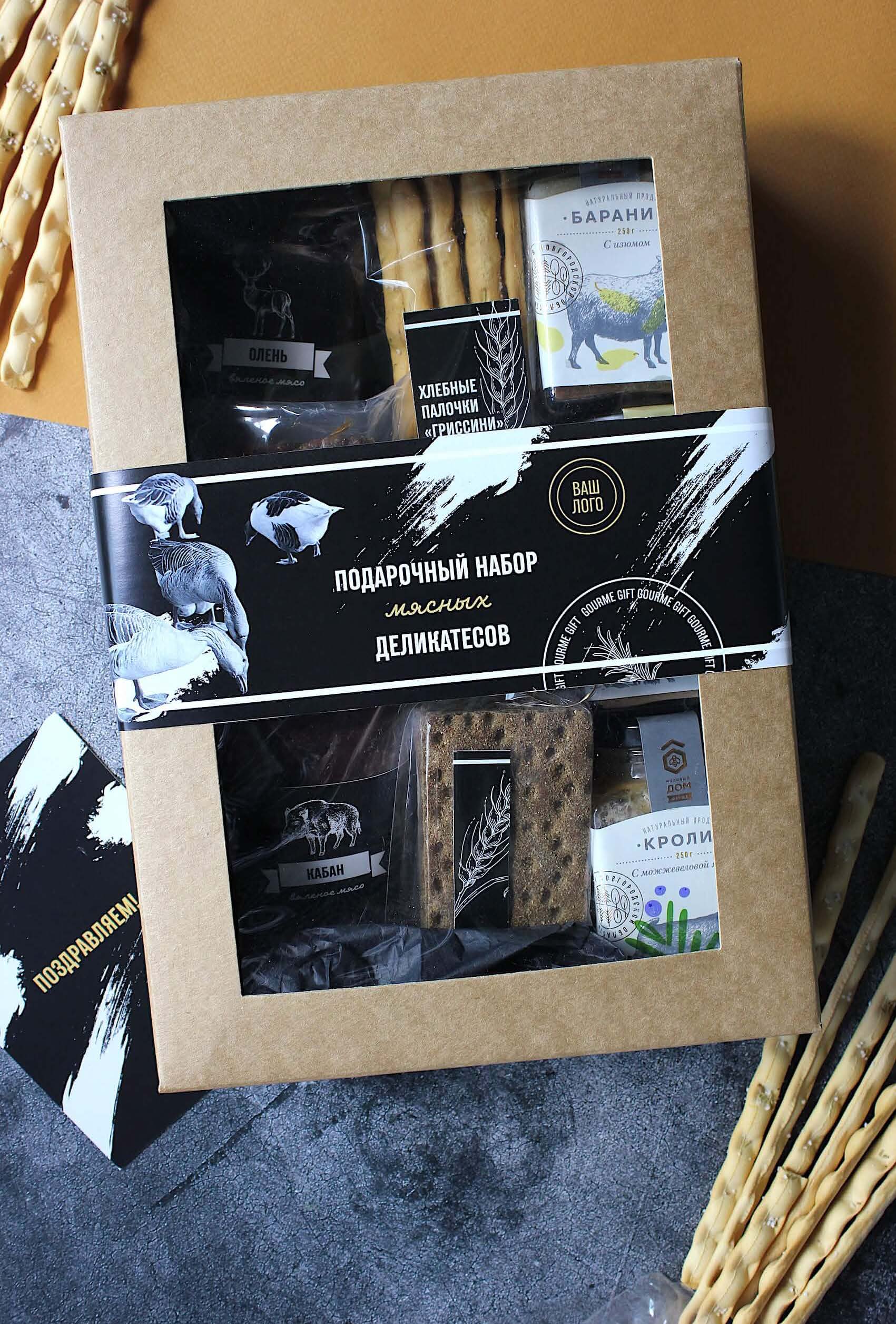 Коробка с самыми популярными мясными закусками: вяленым мясом оленины, утки и кабана, пряными колбасками и деликатесными баночками с кроликом, бараниной и паштетом из индейки!
