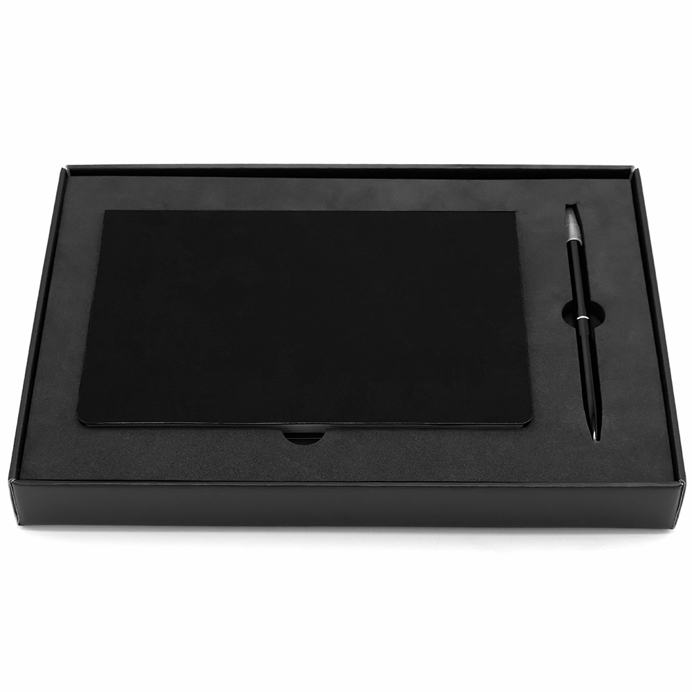 Подарочный набор в стильной цветной картонной коробке черного цвета (крышкой-дно). Внутри на аккуратном ложементе располагаются ежедневник А5 и вечный карандаш с шариковой ручкой.