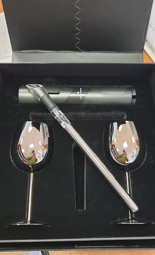 Подарочный набор для вина в составе: 2 бокала (металл), механический штопор (работает от 2х батареек АА — в комплект не входят), пробка для бутылки и охладитель.