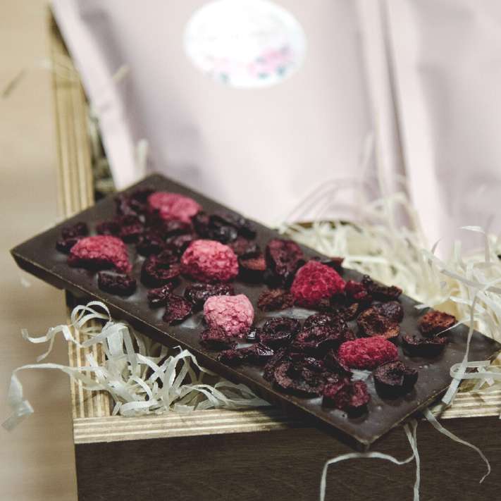 - темный шоколад ручной работы 54,5% какао, малина, ежевика, вишня 100 г