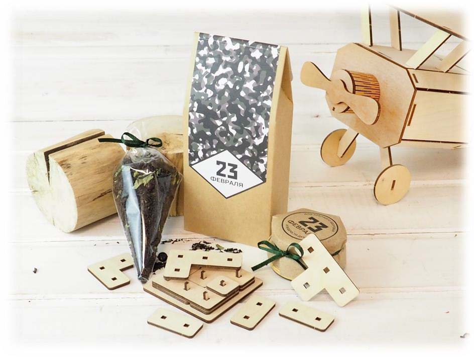 Упаковка — крафт коробка с принтом с декором.